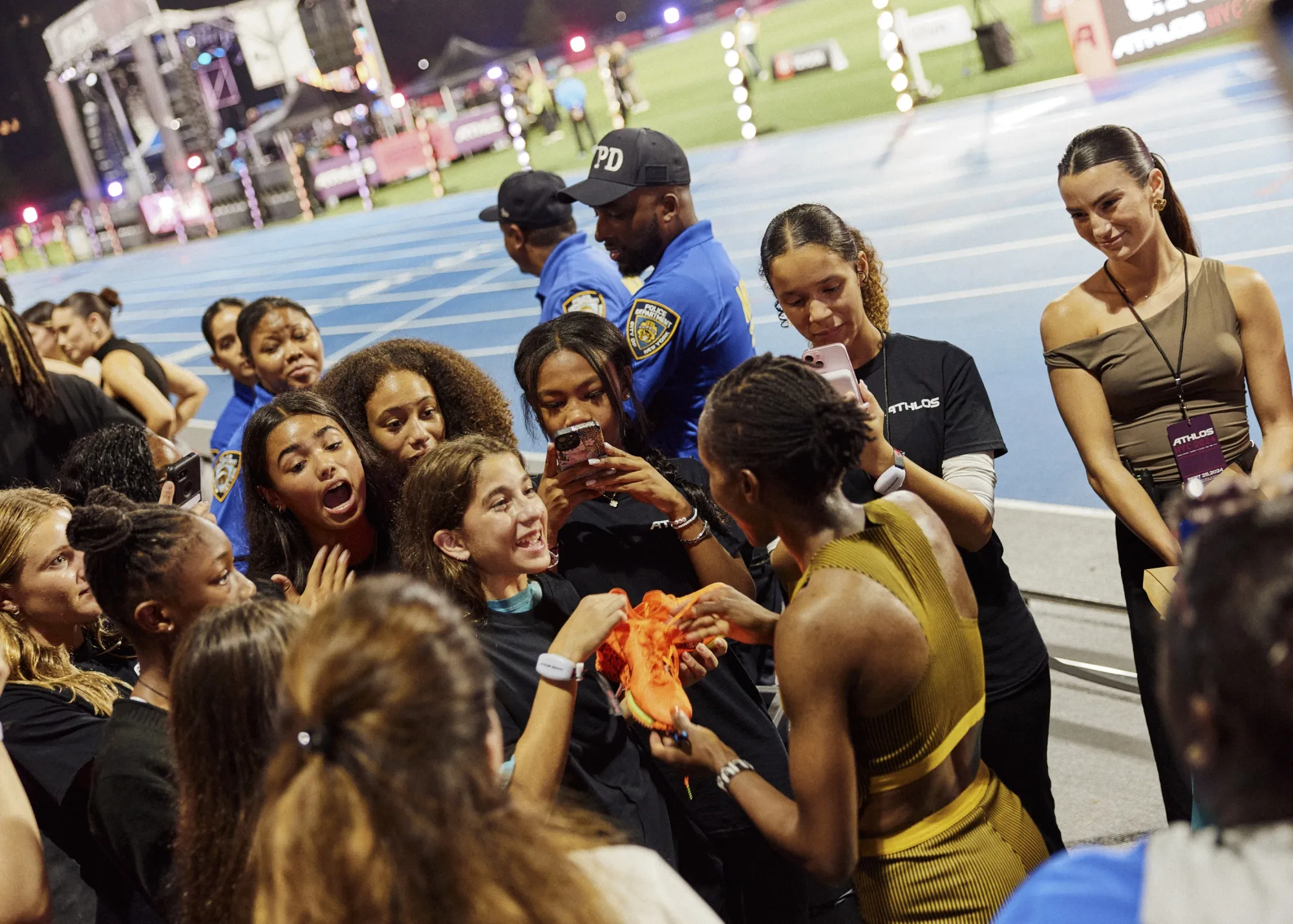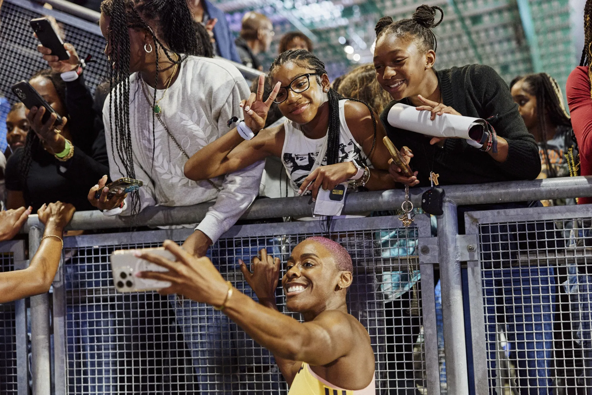 观众中有年轻的跑者,他们表示把这些女性视为榜样,还有一些热情的粉丝,年龄已过60岁。运动员们,包括三次金牌得主Gabby Thomas,走进赛道时手持烟花,伴随着个人入场曲播放。真正的皇冠——来自Tiffany & Co.——被颁发给获胜者,观众们还收到了明亮的LED手环。在当晚的第一场比赛之前,Ohanian表示这不是一次性的投资。