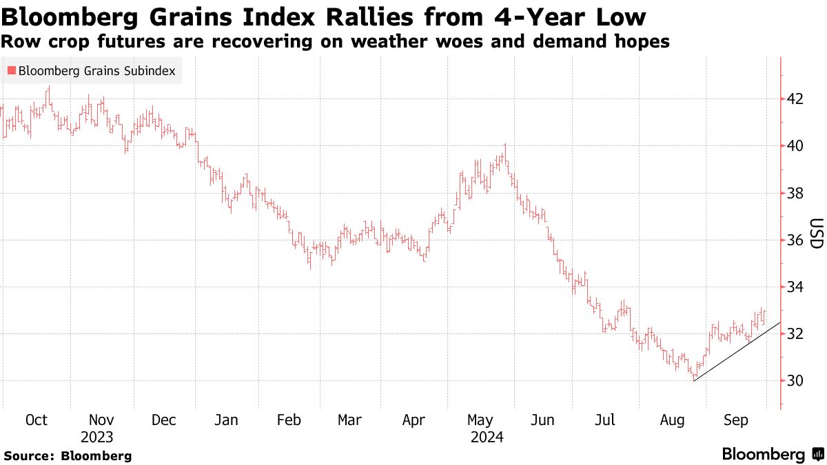 在中国需求疲软和美国丰收前景导致价格在8月跌至四年低点后,行作物期货正在反弹。现在,随着中国经济获得刺激和美国收成可能受到干扰,廉价商品正受到更多购买兴趣,纳什维尔Nesvick Trading Group的谷物分析师埃文·巴斯表示。