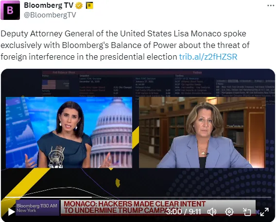今天在彭博电视台的权力平衡早间版中,主持人凯莉·莱因茨采访了副检察长丽莎·莫纳科,讨论外国干预美国总统选举的威胁。