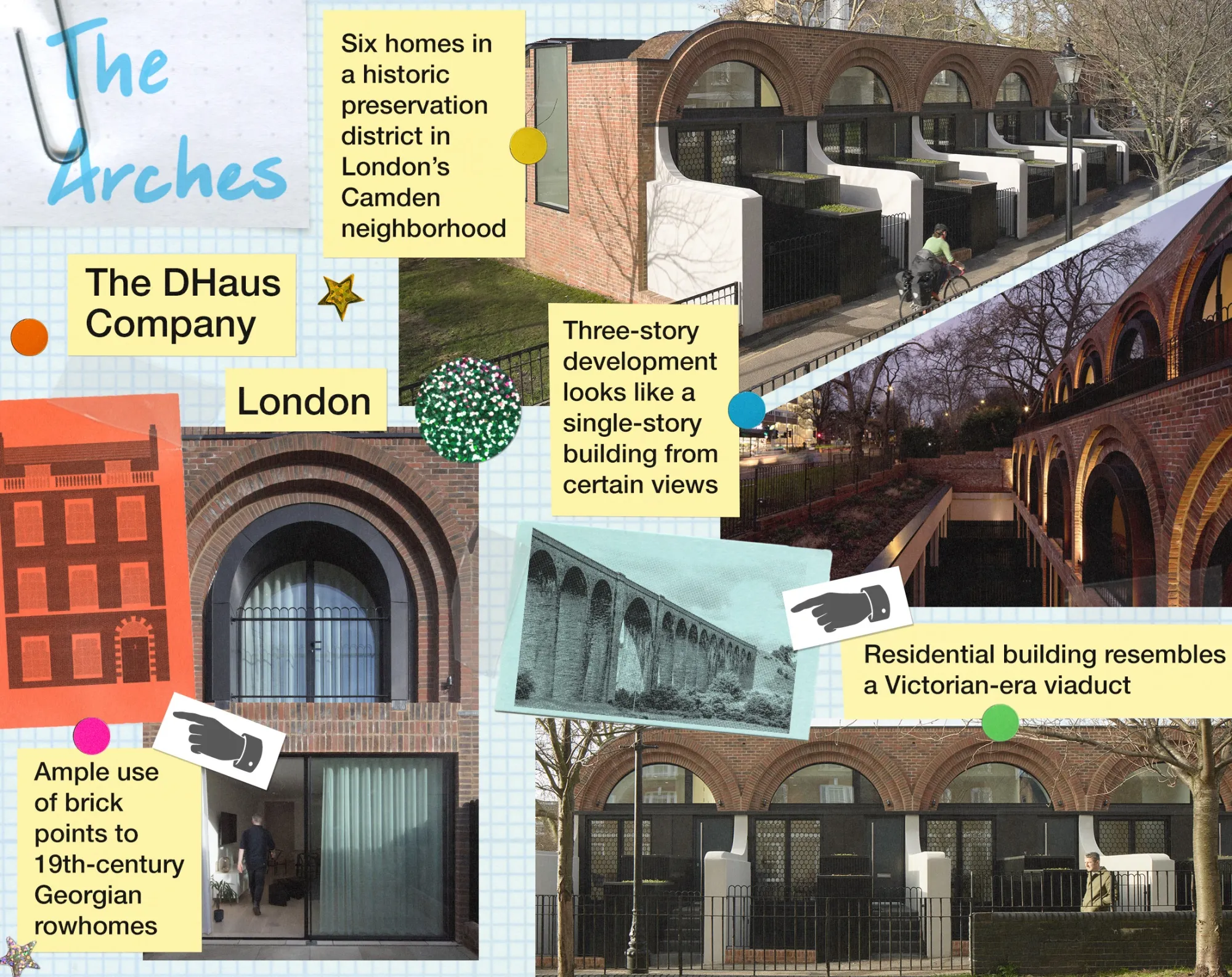 这就是拱门,一系列由英国设计公司DHaus设计并于2023年完工的六座房屋。这是一个近五年的过程,旨在满足其伦敦社区严格的历史保护标准。最终结果是一座现代建筑,向城市的铁路全盛时期、附近18和19世纪联排房屋的新古典主义形式以及当地教堂的地下墓穴致敬。