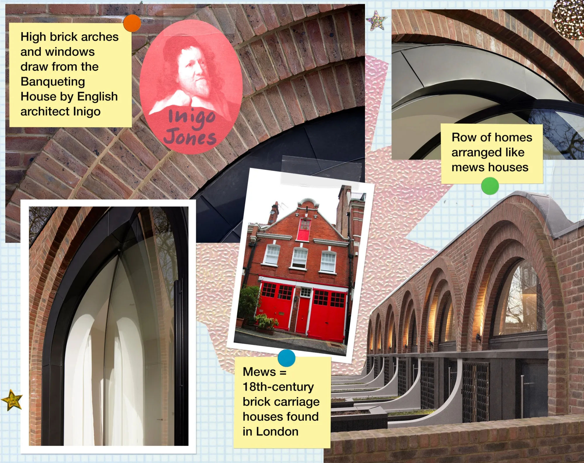 这些形状在当地的铁路桥和宗教场所中随处可见——包括著名的海盖特公墓,卡尔·马克思的墓就在这里——以及该地区的乔治亚排屋和 维多利亚大厦。在设计中,本-格伦伯格和伍尔夫森提到了开创性英国建筑师伊尼戈·琼斯的作品,他是新古典主义建筑引入英国的关键人物。确实,《拱门》似乎向他在 宴会厅中发现的高耸窗户致敬。他们还参考了附近的高架桥和砖砌铁路房屋,那里常见简单的 分段拱门。或许不那么明显的是对建筑师 斯蒂芬·吉瑞的海盖特公墓露台地下墓穴的独特引用。最终的结果是一个类似于小巷的结构,融合了市政的宏伟、工业的厚重和典型于北伦敦住宅区的温馨感。