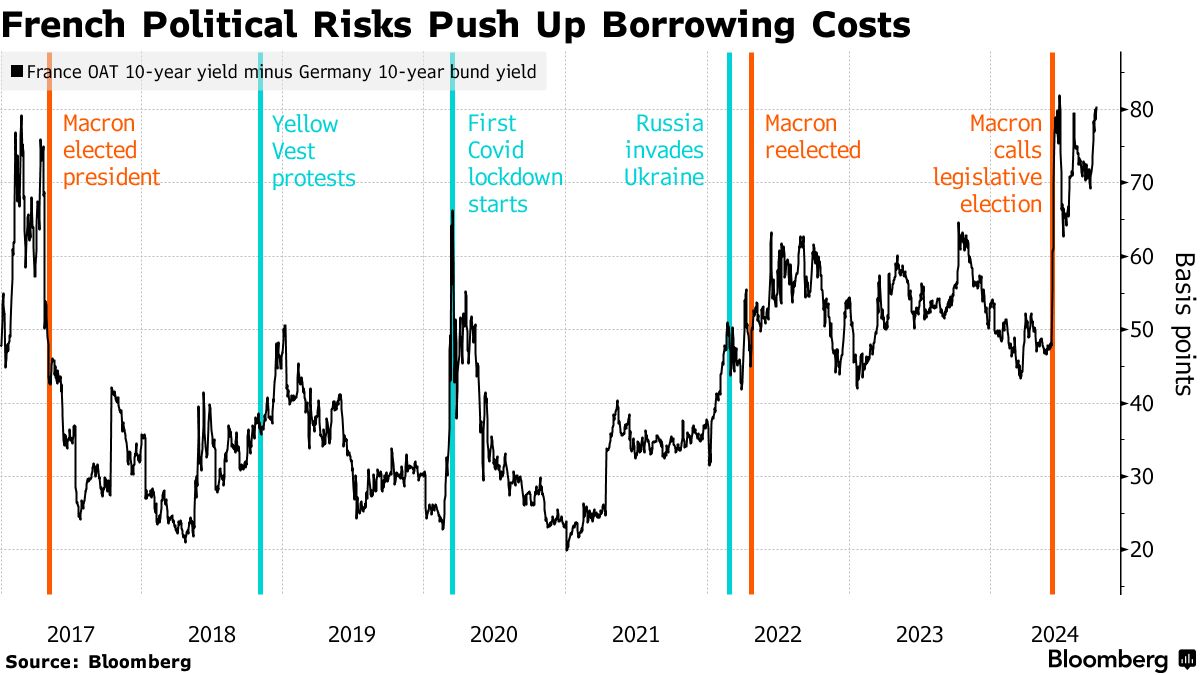 投资者要求持有法国政府债券相对于邻国德国的溢价——这是衡量该国债务风险的指标——已上升至约76个基点,高于法国总统埃马纽埃尔·马克龙在6月宣布提前选举前的50个基点以下。