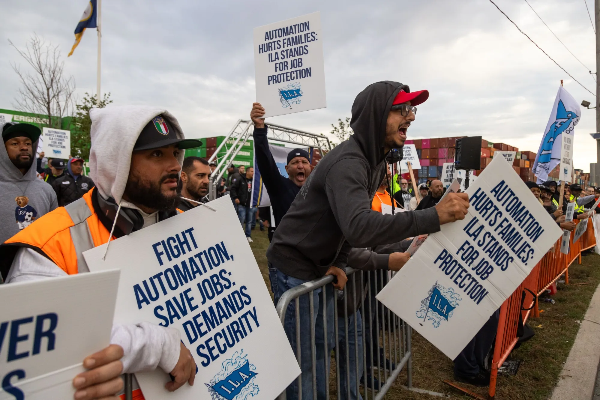 工人在新泽西州纽瓦克的APM集装箱码头外抗议,时间是10月1日。来源:彭博社自从金属集装箱在近70年前彻底改变了运输行业以来,码头工人一直在努力捍卫他们在全球商业中扮演的重要角色。然而,技术进步持续威胁着港口人工劳动的角色。10月1日,国际码头工人协会(ILA)——代表美国东部和墨 Gulf Coast港口所有工人的47,000名会员工会——因要求更高的工资和对自动化的保护而罢工。这对世界最大经济体的影响是严重的,而罢工恰好在11月5日美国选举前几周开始。