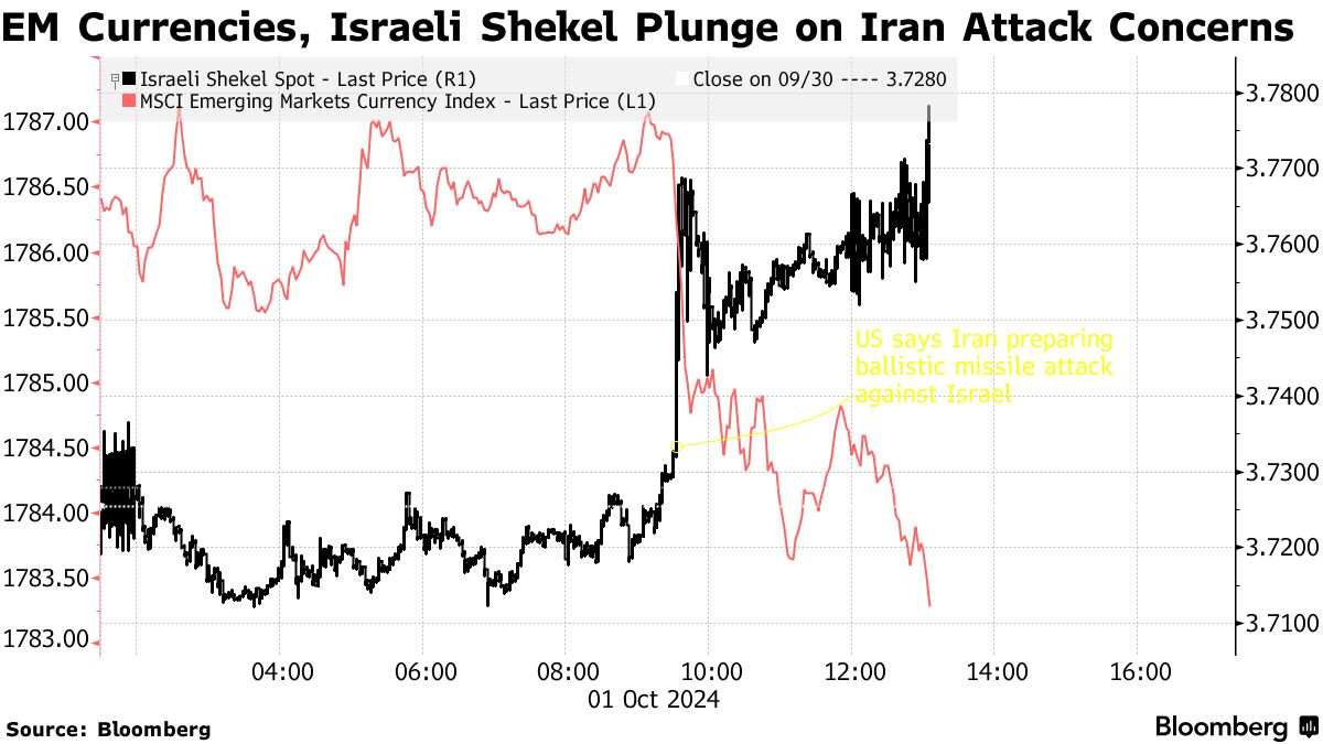 以色列军方周二表示,伊朗向该国发射了超过100枚弹道导弹。这次发射是在以色列军队进入南黎巴嫩,作为对德黑兰支持的真主党的行动的一部分后进行的。一位白宫高级官员在袭击发生前几个小时警告称袭击即将发生,导致风险资产抛售。油价在事后飙升,而黄金上涨,股票下跌,成为全球避险潮的一部分。