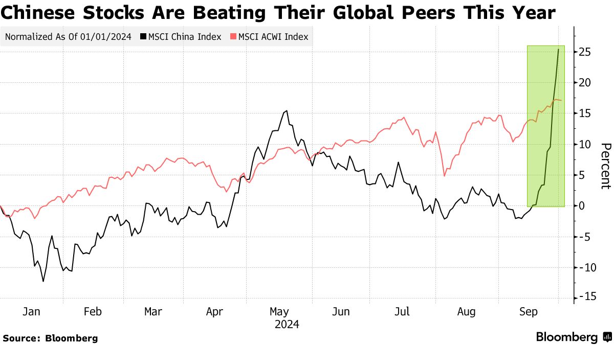 这次反弹激发了人们对中国股票三年亏损期结束的乐观情绪。该市场自2021年高点至9月中旬几乎失去了近一半的价值,现在突然吸引了许多基金行业的巨头。亿万富翁投资者David Tepper正在购买与中国相关的“一切” ,而全球最大的资产管理公司BlackRock Inc.现在对中国股票持 超配 观点。