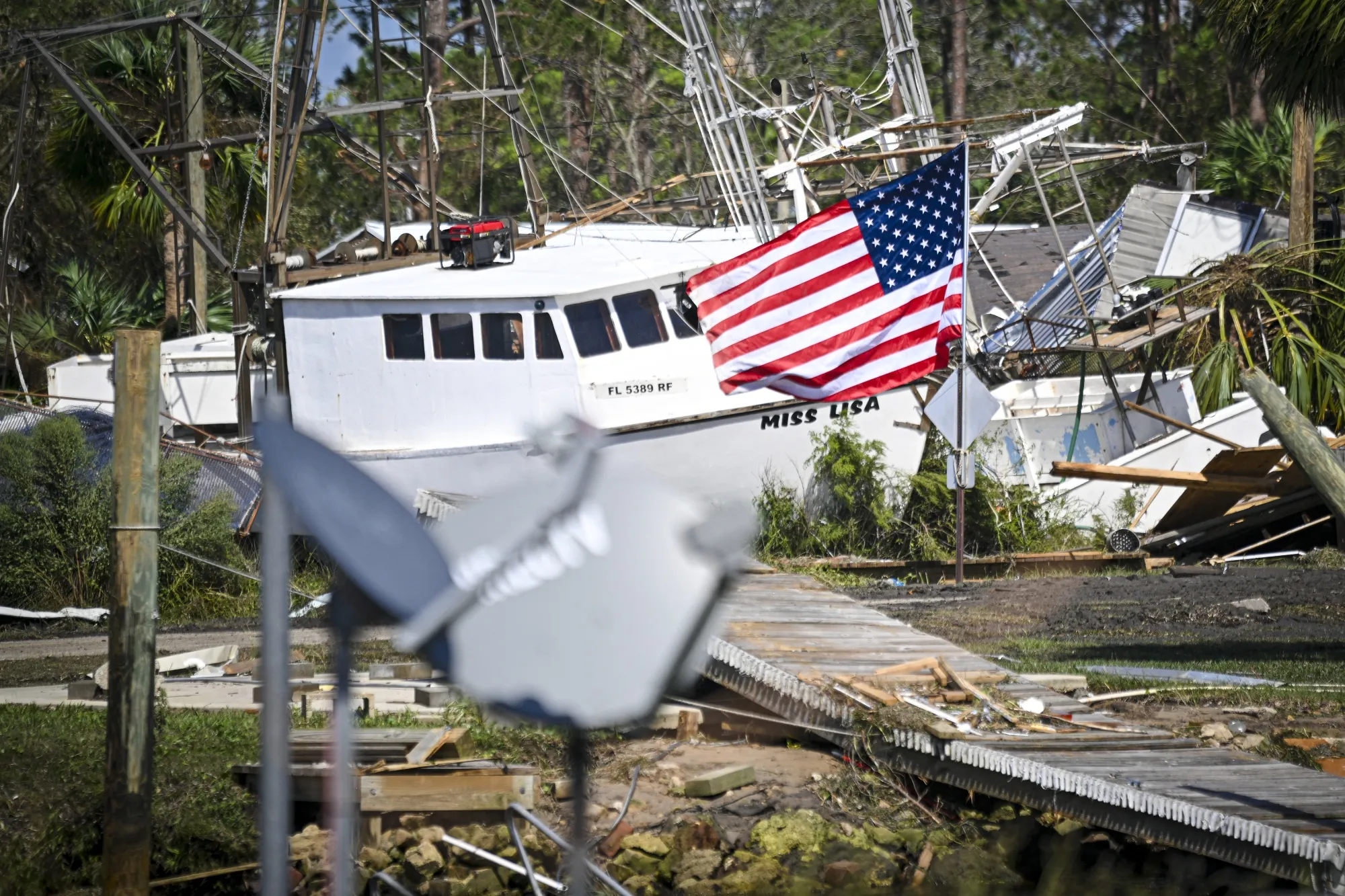 一艘被飓风海伦推上岸的船只,位于佛罗里达州基顿海滩。