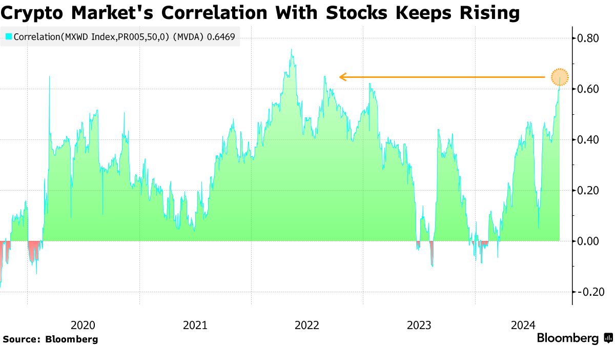 根据彭博社汇编的数据,前100种数字代币与MSCI Inc.全球股票指数的50天相关系数为0.65,为2022年以来的最高水平。1的读数表示资产同步移动,而-1则表示反向关联。