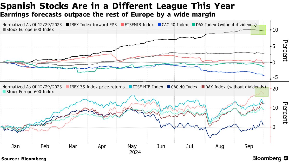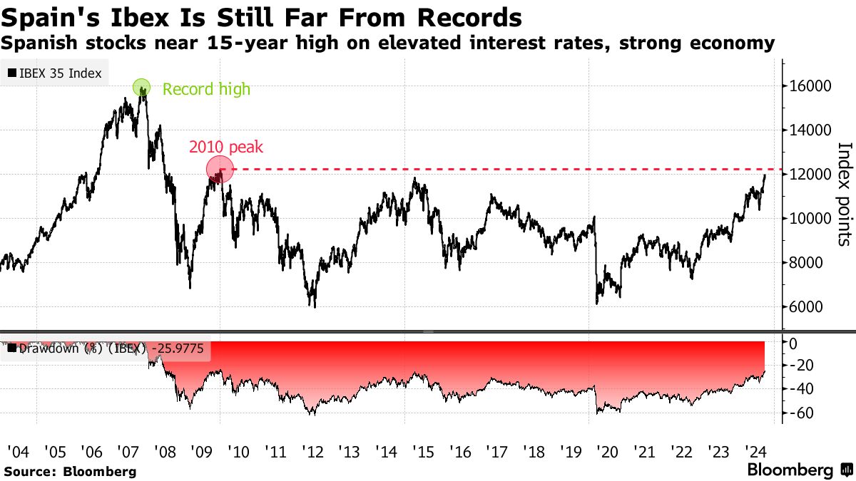 伊比萨35指数在2024年上涨了16%,超越了其他主要欧洲市场。该指数接近15年来的最高点,并且有望实现自2004-2006年辉煌时期以来的最佳两年反弹。虽然银行可能引领了这一趋势,但这种强劲势头更为广泛,得益于收益预期在欧洲其他地方快速上升。