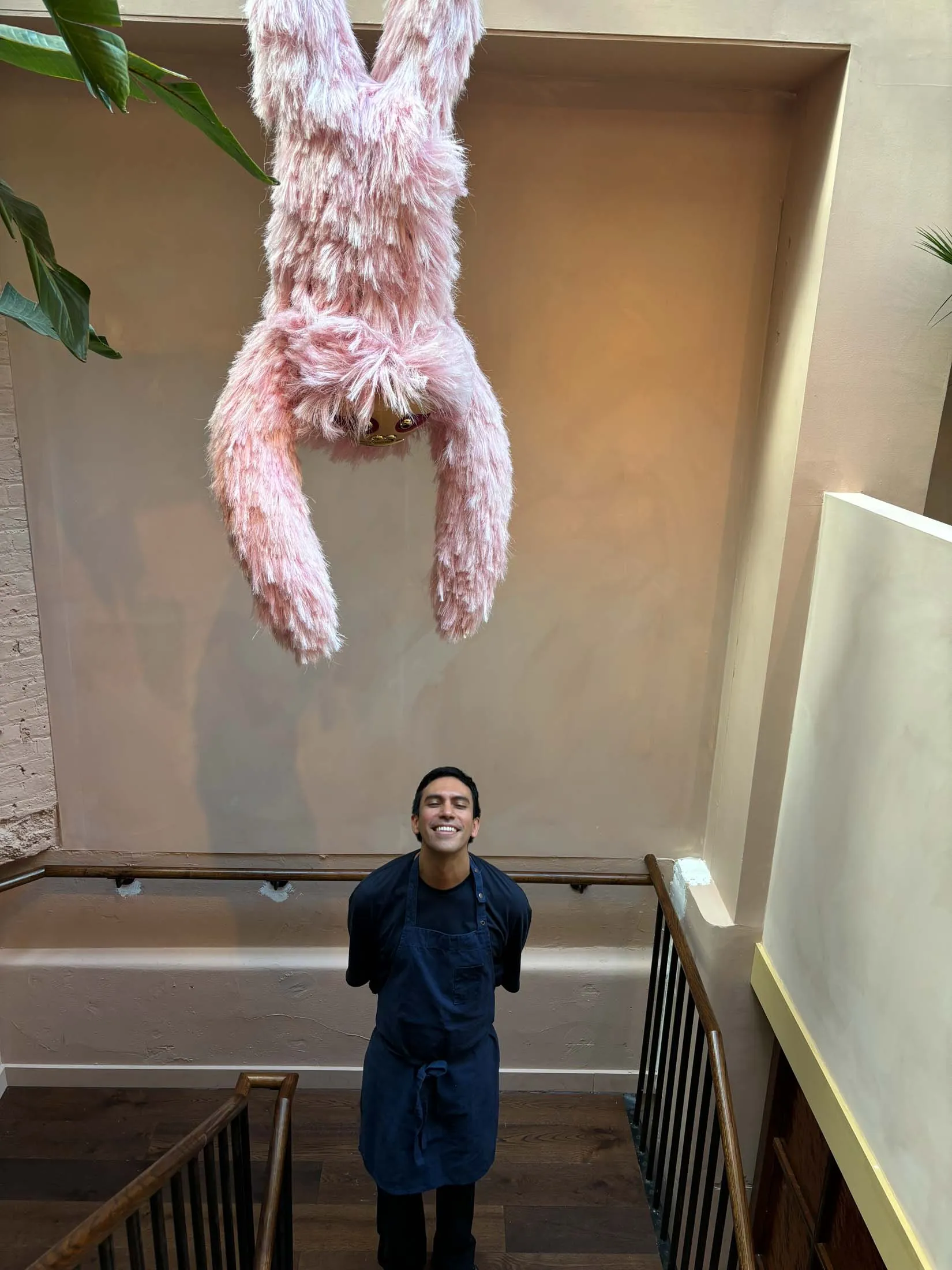 这家餐厅楼上有80个座位,待他们在今年晚些时候开放楼下的“粉红大厅”时,还会增加30个座位,感觉热带气息浓厚,摆满了大型植物和色彩丰富的拉丁美洲墙饰,背景是不同深浅的棕色和赭色。但装饰房间的亮点是一只悬挂在楼梯上的巨型粉红树懒。Lastra给它起名为潘乔,你不能离开餐厅而不在它下面拍照。