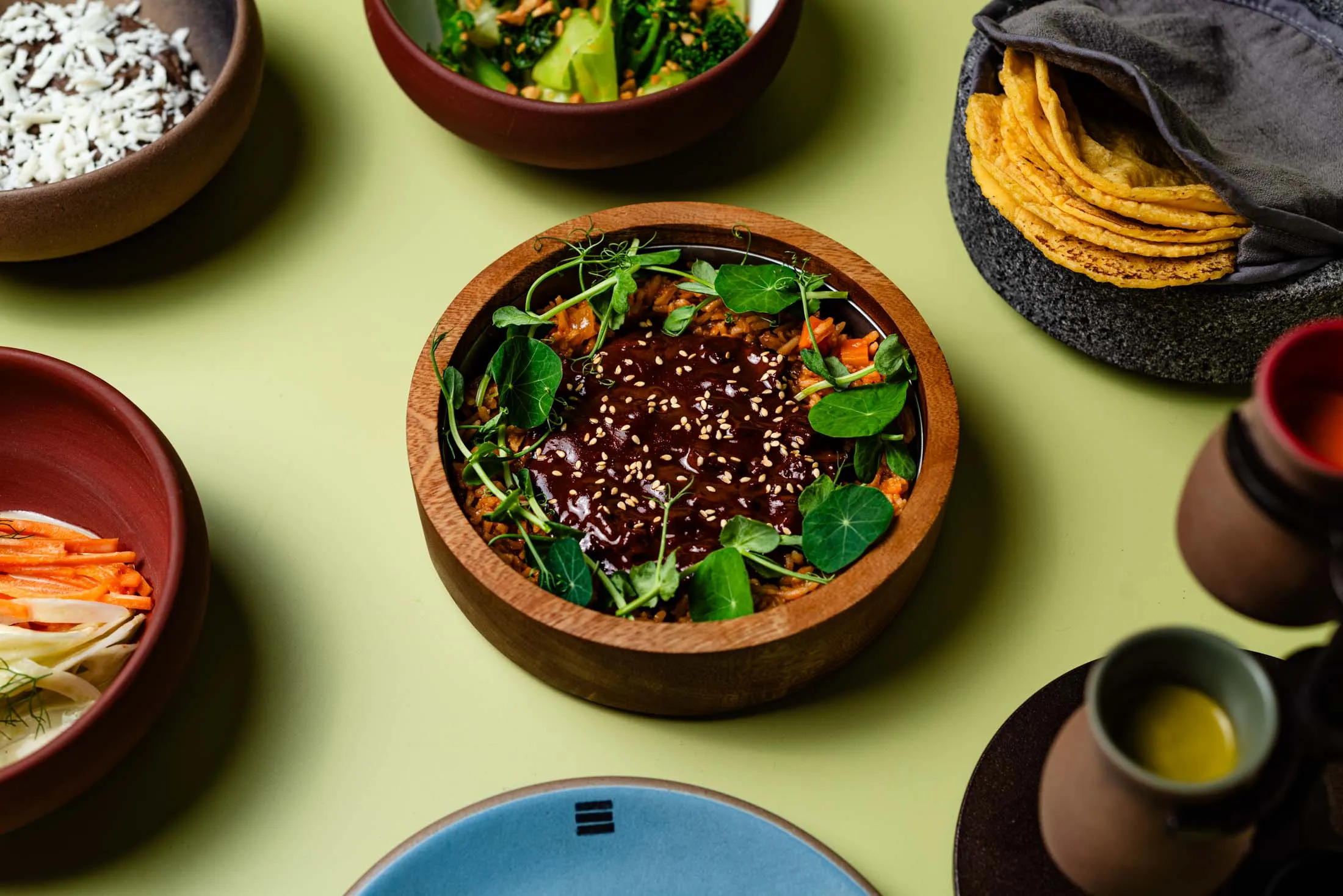 像墨西哥的这些地方一样,Fonda厨房的骄傲之处在于两个comal,一个是粘土制的,一个是铸铁的,安装在一个笨重的陶土架子上,散发着浓厚的玛雅气息。拉斯特说,他专门用来做玉米饼的粘土comal是从瓦哈卡进口的;他声称这是你在墨西哥以外找到的唯一几个之一。