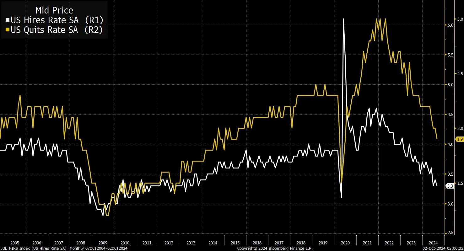 在美联储九月份最新的利率决定中,降息50个基点时,存在不确定性和戏剧性。但显然人们知道50是一个选项,部分原因是主席杰罗姆·鲍威尔在杰克逊霍尔发表了非常紧急的演讲。他紧急的原因非常具体。他并不担心GDP增长。他并不担心金融市场的波动。他担心的是劳动力市场的强度,显然根据一系列指标已经减弱。失业率上升了。招聘率下降了。职位空缺大幅减少等等。关于经济状况有很多混乱(仍然存在),但劳动力市场的降温相当明显。无论如何,由于充分就业是美联储双重任务的一部分,它以果断的方式开始了降息周期,降息50个基点。下次美联储会议是11月7日,市场倾向于仅降息25个基点。我在想的是,美联储(或具体来说是鲍威尔)是否仍然对切断劳动力市场的左尾结果感到同样的紧迫感。有两件事让我特别思考这个问题。首先是昨天的JOLTS报告。招聘率和辞职率继续显示出持续的软化。招聘率很重要,因为失业率上升的部分原因是更多的人进入了劳动力市场(而不是裁员)。好吧,在某个时刻,经济将需要吸纳寻找工作的人。而招聘率下降是朝着错误的方向。辞职率告诉你,人们没有其他工作安排,或者他们对现在离开后找到另一份工作的信心不足。