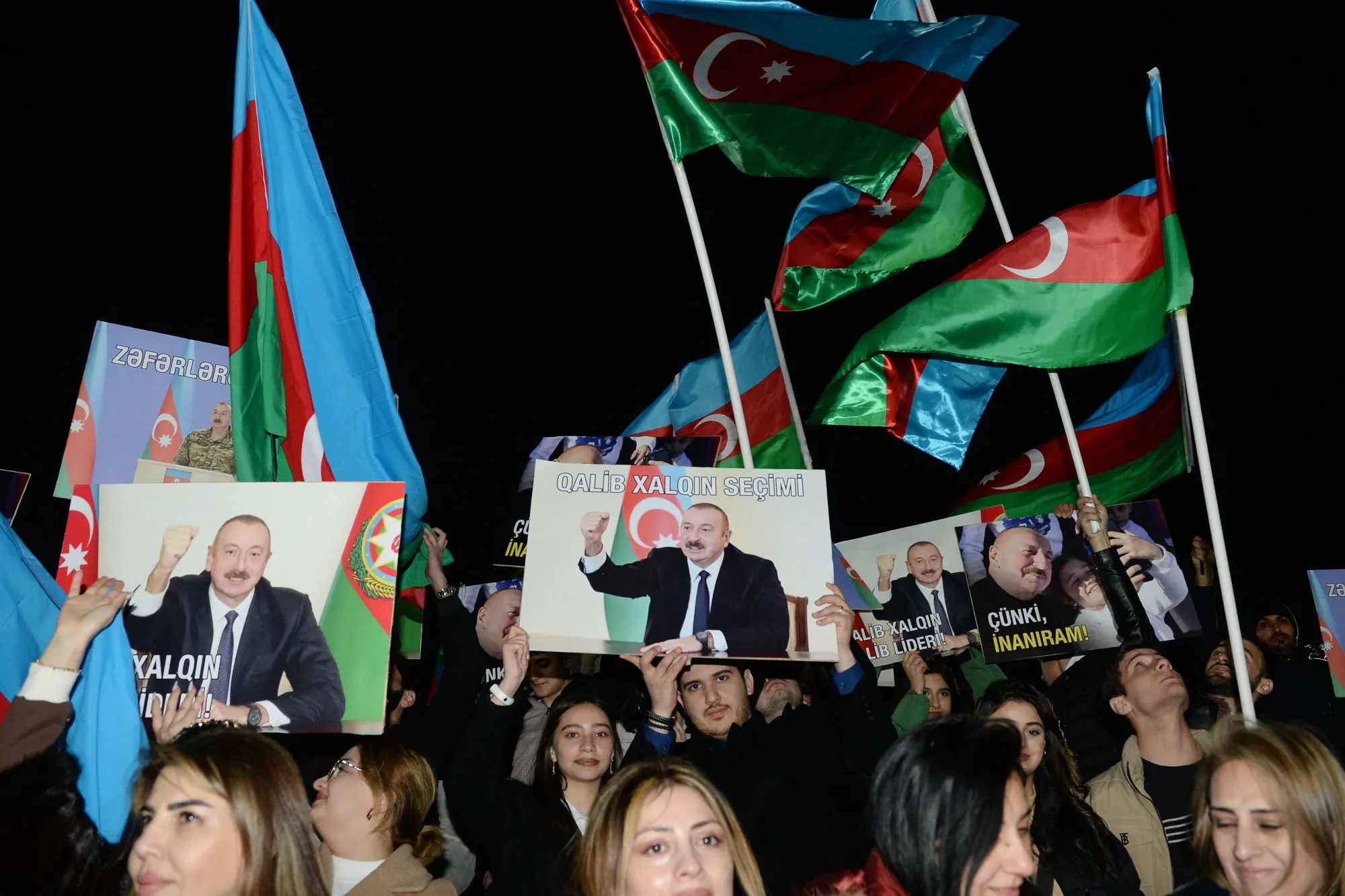 伊尔哈姆·阿利耶夫的支持者在巴库参加了一场快闪总统选举的集会,投票结束后,时间是在二月。