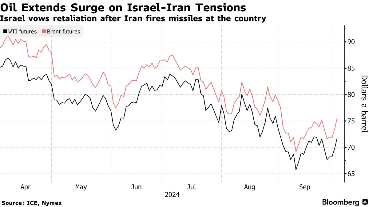 原油价格继续上涨,因为交易者在等待以色列对伊朗导弹攻击的回应,而升级使油市恢复了战争溢价。