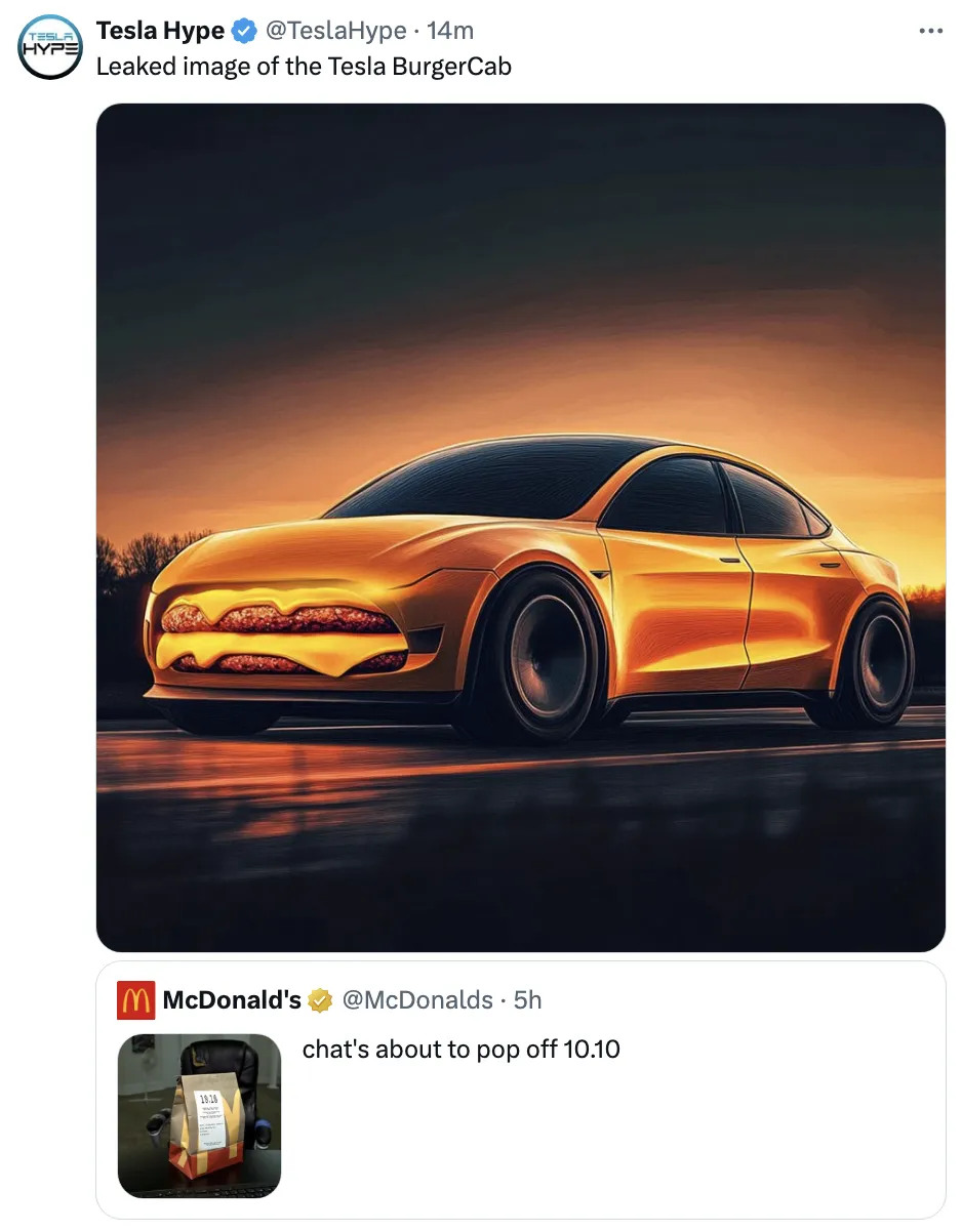 在八天后,埃隆·马斯克预计——强调在预计——将进行他的特斯拉机器人出租车发布。奇怪的是,麦当劳也在 预告将在10月10日推出新产品。这可能只是个无关紧要的事情——呃,不得不——但是互联网 侦探正在乐在其中将两者联系起来: