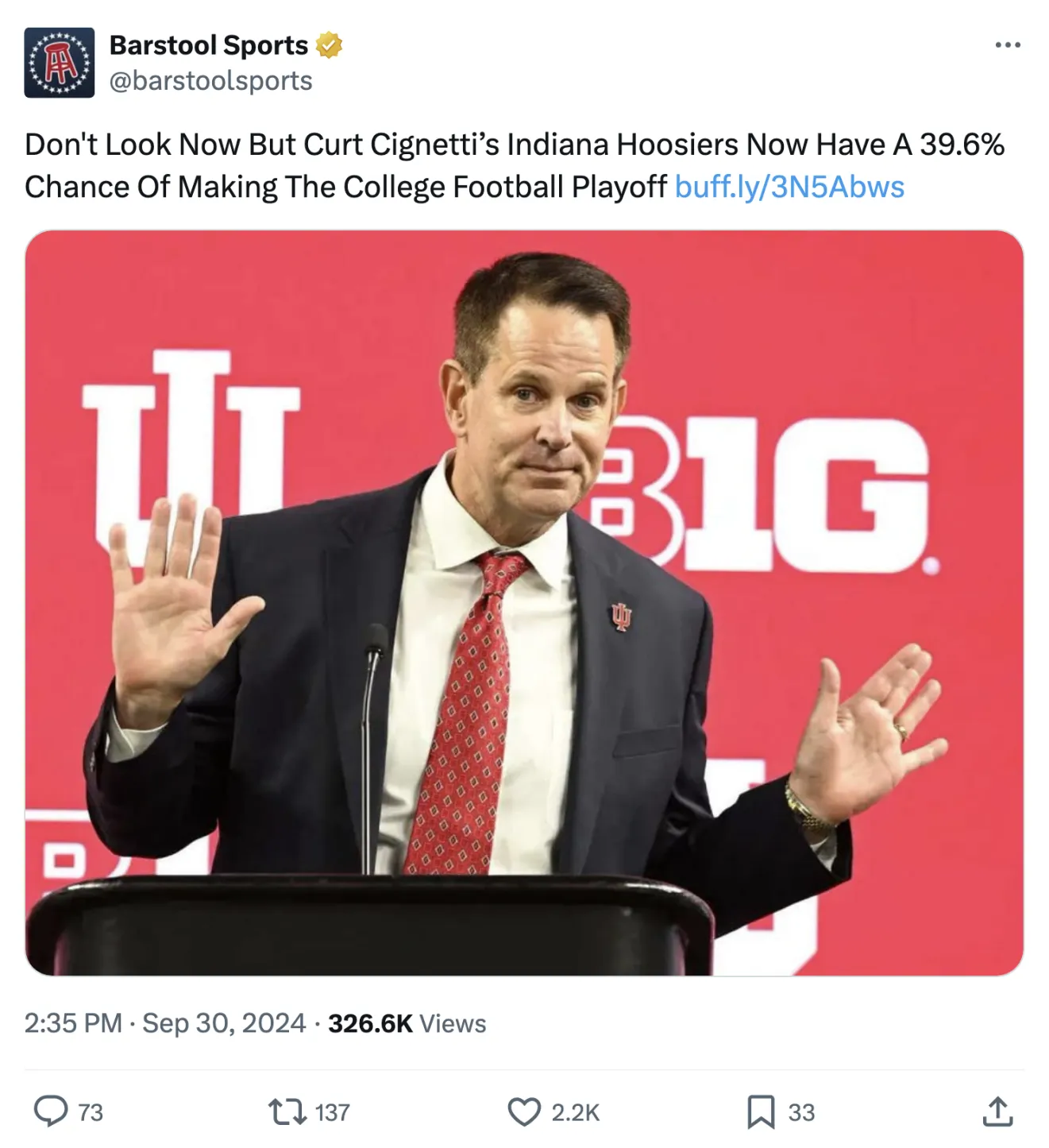 我很高兴地报告,我的母校,印第安纳大学,再次随机优秀于足球!就像,我们可能会进入季后赛一样好: