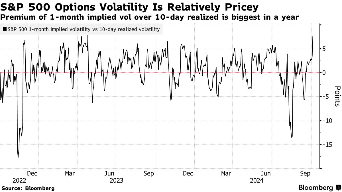 彭博情报的首席衍生品策略师Tanvir Sandhu表示,Cboe波动率指数(VIX)在选举年通常会在十月上升,然后在事件发生前出售。然而,今年,投资者的关注点更多集中在美国经济和联邦储备利率削减的速度上,至少目前是这样,期权专家表示。
