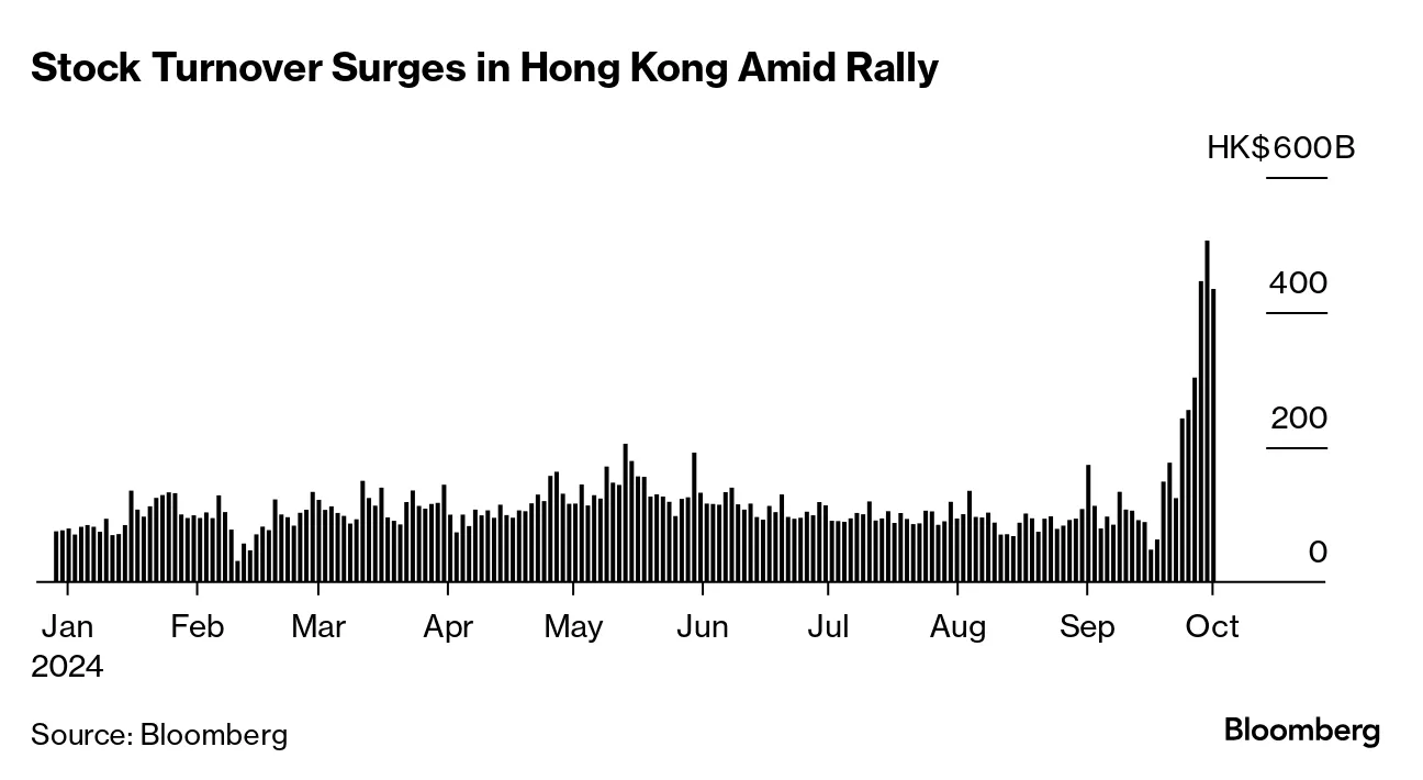 - 周三成交额达到4340亿港元(559亿美元),仅略低于周一的纪录,因为股票创下多年来的新高。