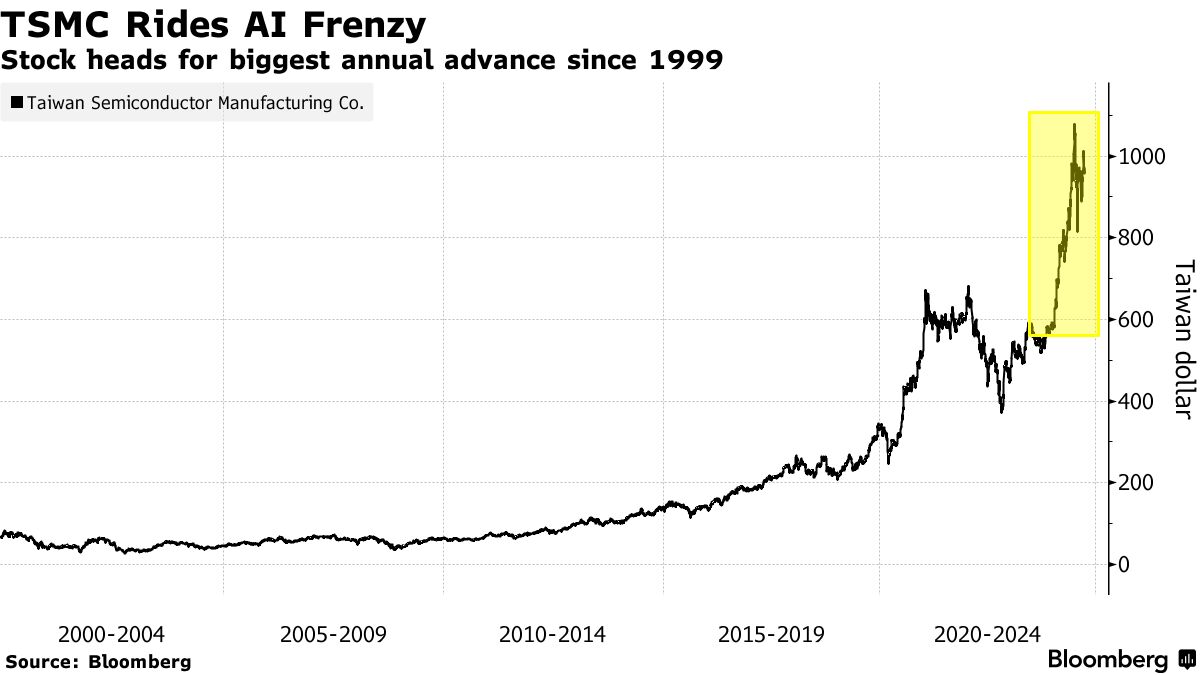 台积电今年上涨了64%,是25年来表现最好的年份,因为它被视为全球人工智能供应链中的关键角色。这是一只高度波动的股票,年化50天历史波动率为49%。收益、监管举措和技术趋势等头条新闻常常引发股票的大幅波动。