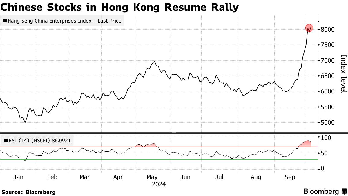 恒生中国企业指数在周五上涨了2.8%。该指数在前一交易日结束时下跌了1.6%,此前经历了13天的连胜,但较9月份的低点上涨了超过35%。中国大陆市场在黄金周假期期间将持续关闭至周一。