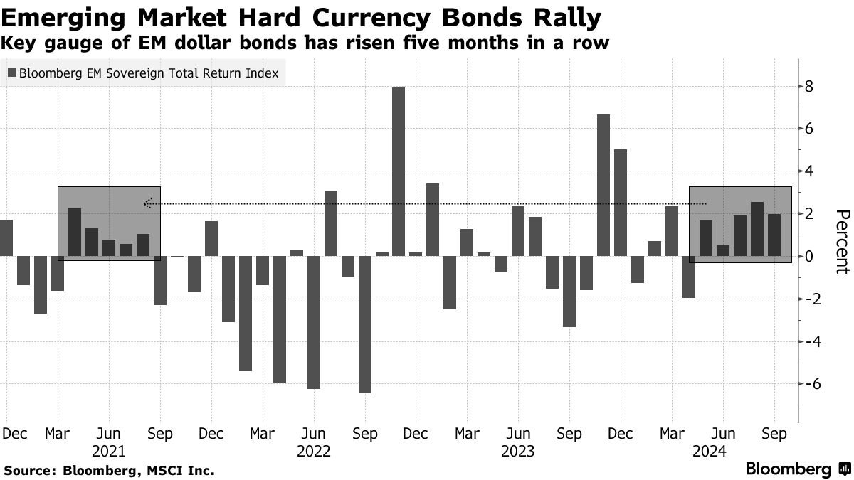 “支持性的宏观背景,包括较低的美国利率和疲软的美元,继续有利于新兴市场硬通货债券,但即将发布的就业数据可能会提供下一个上涨的动力,”花旗集团的策略师亚历山大·罗热茨金在给客户的报告中写道。