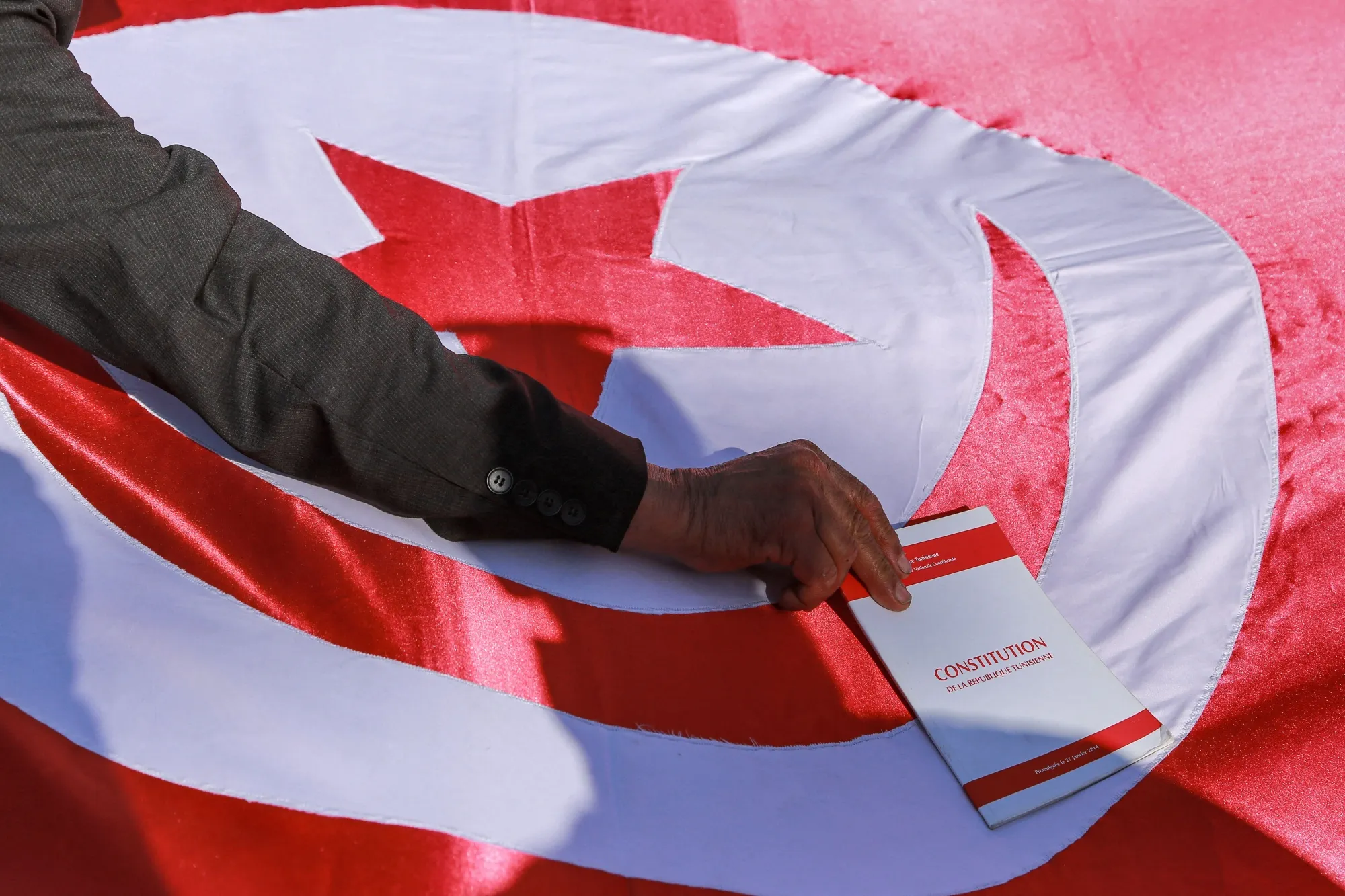 2022年2月13日在突尼斯,突尼斯宪法的副本放在国旗上。