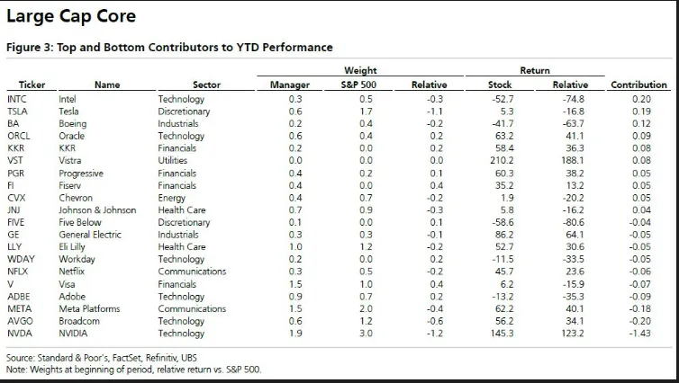 瑞银发布了一份关于大型主动管理者的报告。惊喜,惊喜:截至2024年,他们的表现落后于标准普尔500指数2.1%,扣除费用。由帕特里克·帕尔弗雷领导的策略团队指出,今年尤其艰难,因为收益主要由最大公司主导。仅仅是英伟达(根据彭博数据,今年占标准普尔500指数反弹的23%)就造成了143个基点的表现不佳。