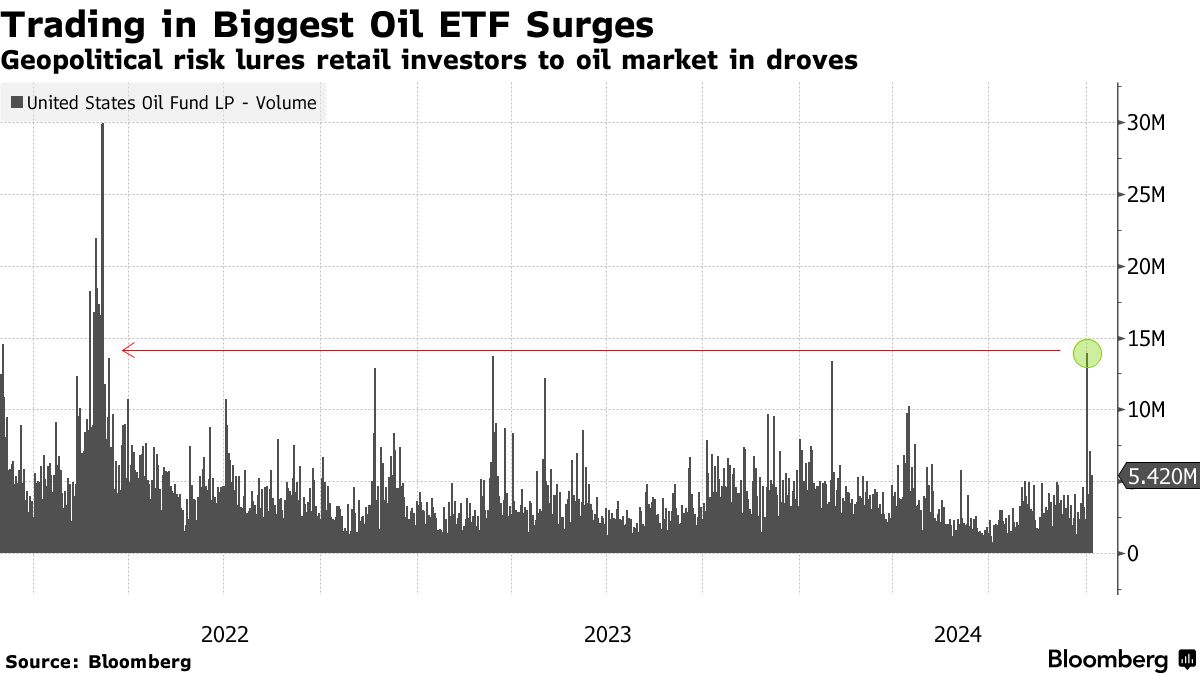 他并不是唯一一个涌向市场的所谓油“游客”,因为战争风险使期货价格飙升。随着伊朗对以色列的攻击使油价在过去一周内飙升超过6美元,零售投资者纷纷涌入与石油相关的产品。