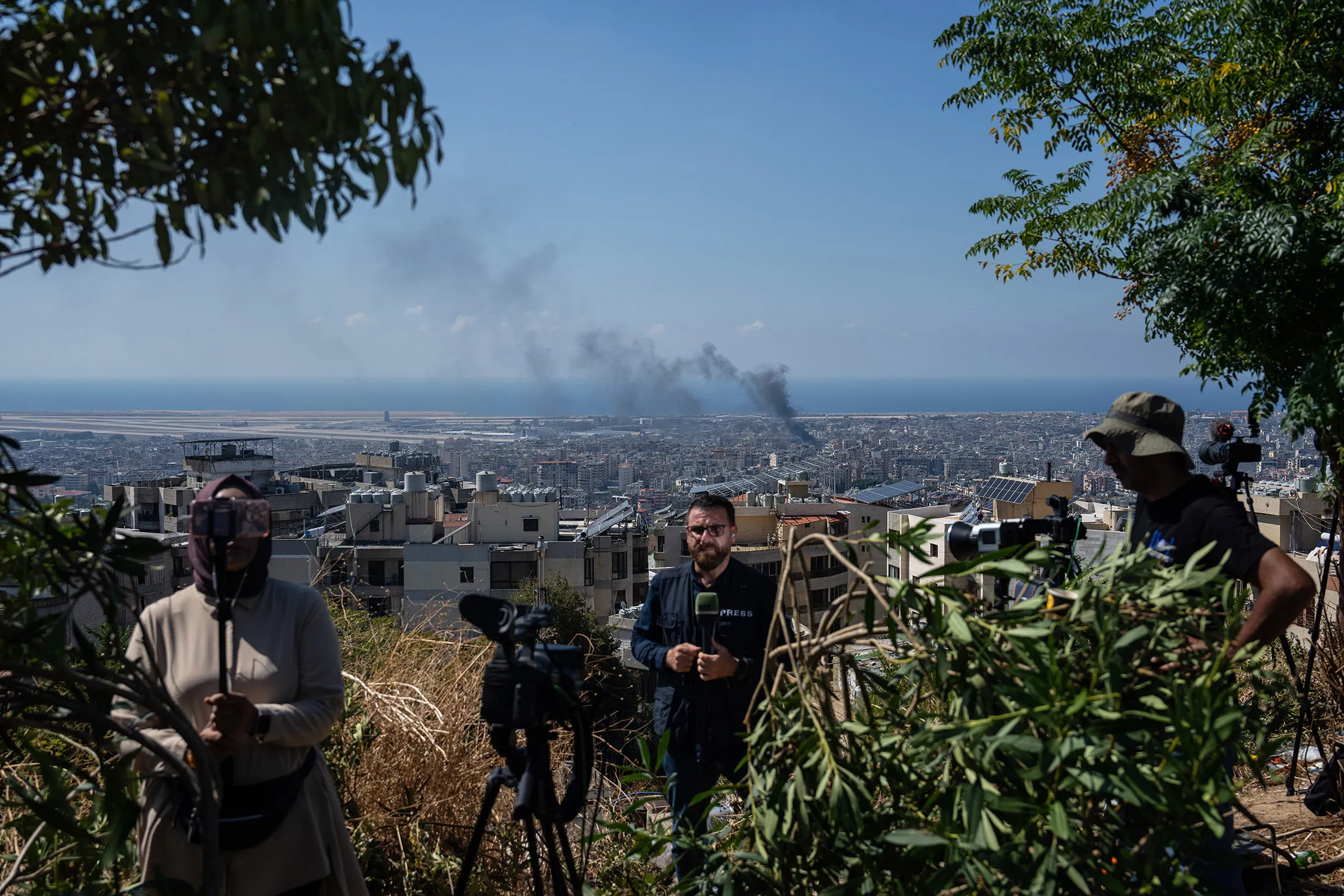 记者从贝鲁特达希耶地区的一个观察点报道,10月5日以色列空袭后,烟雾升起。