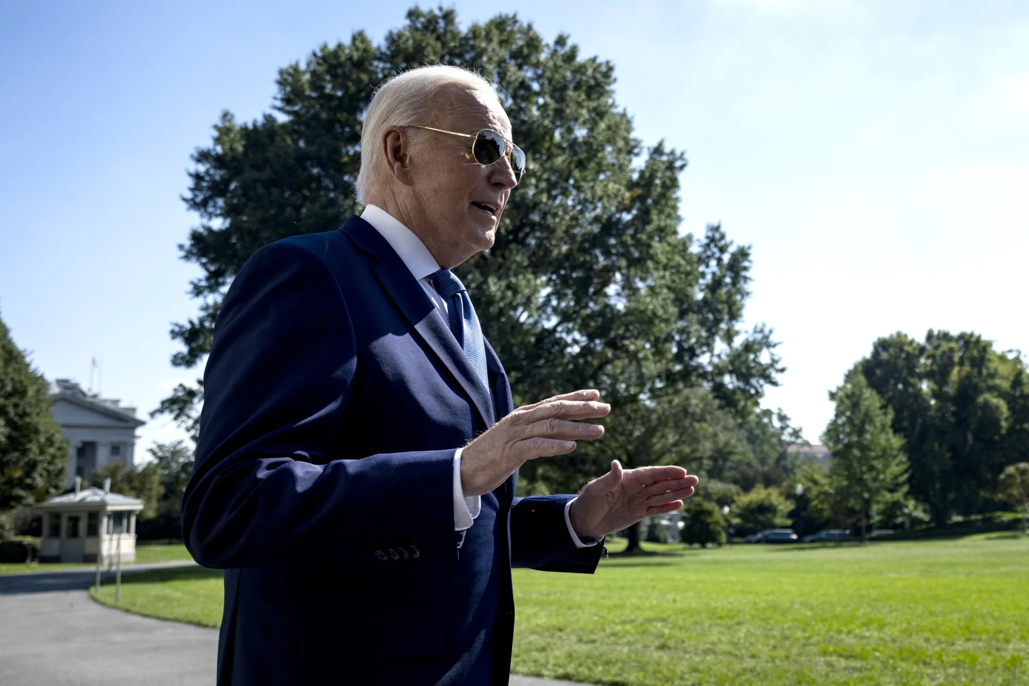 总统乔·拜登在华盛顿特区白宫南草坪对媒体成员发表讲话,时间为10月5日。