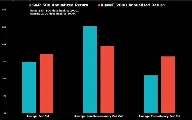 当降息周期发生在非衰退期时,这些收益甚至更强。在这些情况下,大型股的平均年化回报率为25%,而在衰退期间则为11%;小型股在非衰退期间的回报率为20%,而在衰退期间为17%。