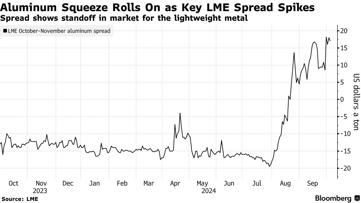 铝市场出现了 加剧的紧缩 的迹象,伦敦金属交易所10月交货的合约交易价格高于 11月合约的溢价。在LME系统中排队提取铝的交易商面临压力,因为他们需要在等待时滚动对冲头寸,而仓库所有者Istim Metals LLC有争议地提高了一项关键管理费用,使得如果价格对他们不利,重新注册这种轻金属的成本大幅增加。市场还在关注Trafigura Group持有的大量10月合约的多头头寸——同一交易商最初将大量铝存放在Istim的仓库中。