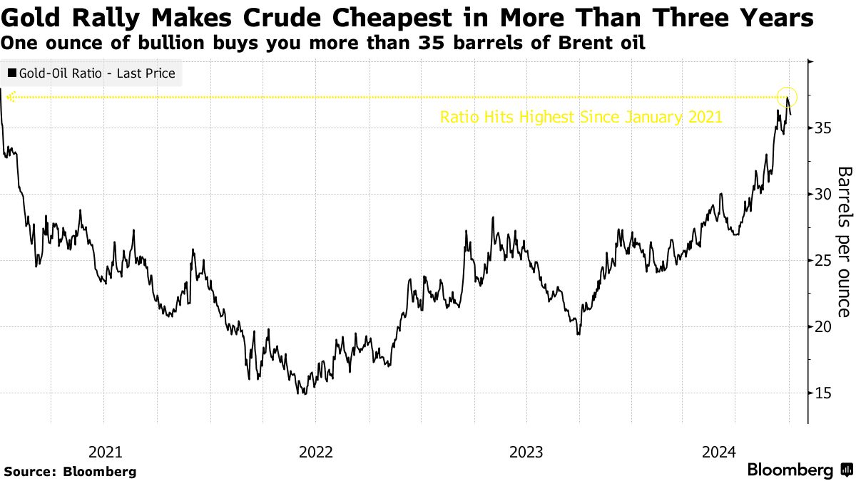 黄金在今年迅速上涨至屡创新高的水平,从某种程度上来说,使得石油成为三年来最便宜的商品——尽管 中东冲突升级 正在削弱一些动能。在9月26日,一盎司黄金购买了超过37桶布伦特原油,这是自2021年1月以来的最高水平——这要归功于当天黄金创下新的历史高点。以色列对黎巴嫩真主党的空袭 目标 和伊朗最近对以色列的报复性导弹攻击,随后推高了原油价格,冷却了黄金与石油的比率。不过,水平仍接近近期高点。在疫情初期,当时石油价格处于18年来的低点时,一盎司黄金可以购买超过87桶石油。