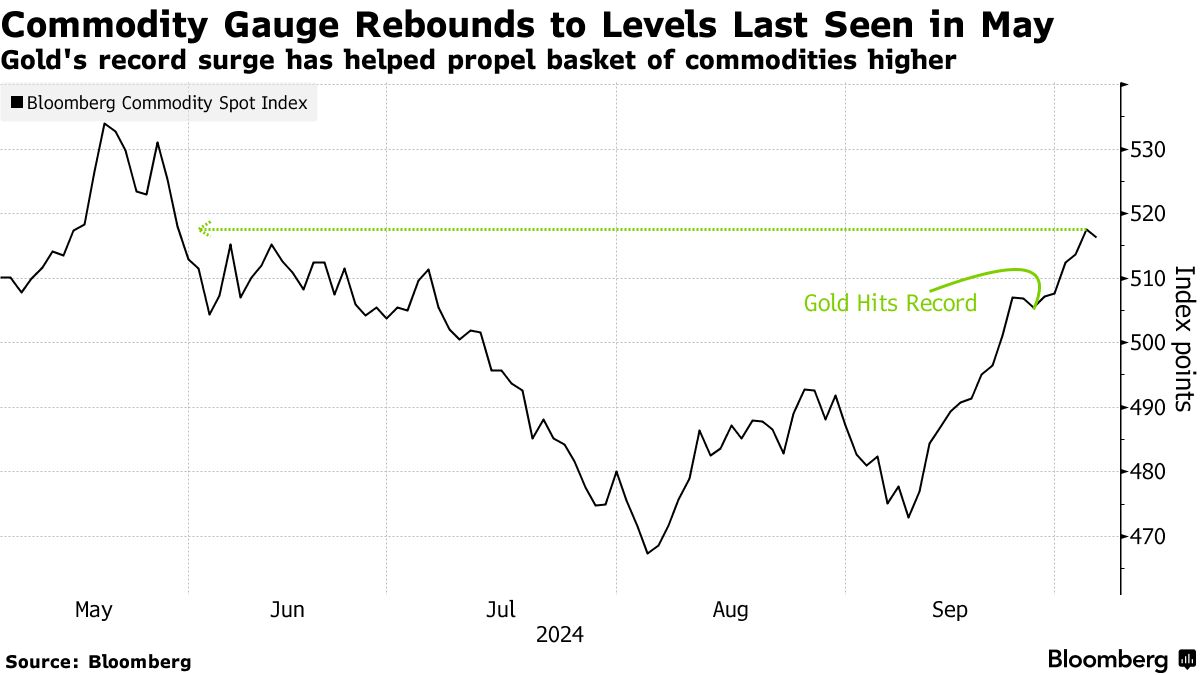 彭博商品现货指数已反弹至自5月底以来的高点,部分受到黄金屡创新高的推动。黄金在该指数中占17%的权重,该指数包括24种商品的期货合约,涵盖农业、能源和金属市场。最近的反弹 天然气 和 铜 在9月份的反弹也帮助提升了该指数,而中东的战争 推动了 原油期货在10月初的上涨。
