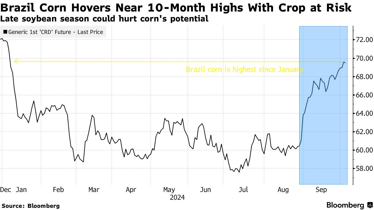 巴西的玉米价格徘徊在今年一月初的高位,这得益于为期五周的上涨。本季作物面临重大威胁,因为大豆的种植严重延迟。巴西主要生产地区普遍干燥的天气影响了大豆作物,这可能对玉米产生连锁反应。玉米通常在大豆收获后和雨季结束前种植。巴西是全球第二大谷物供应国。