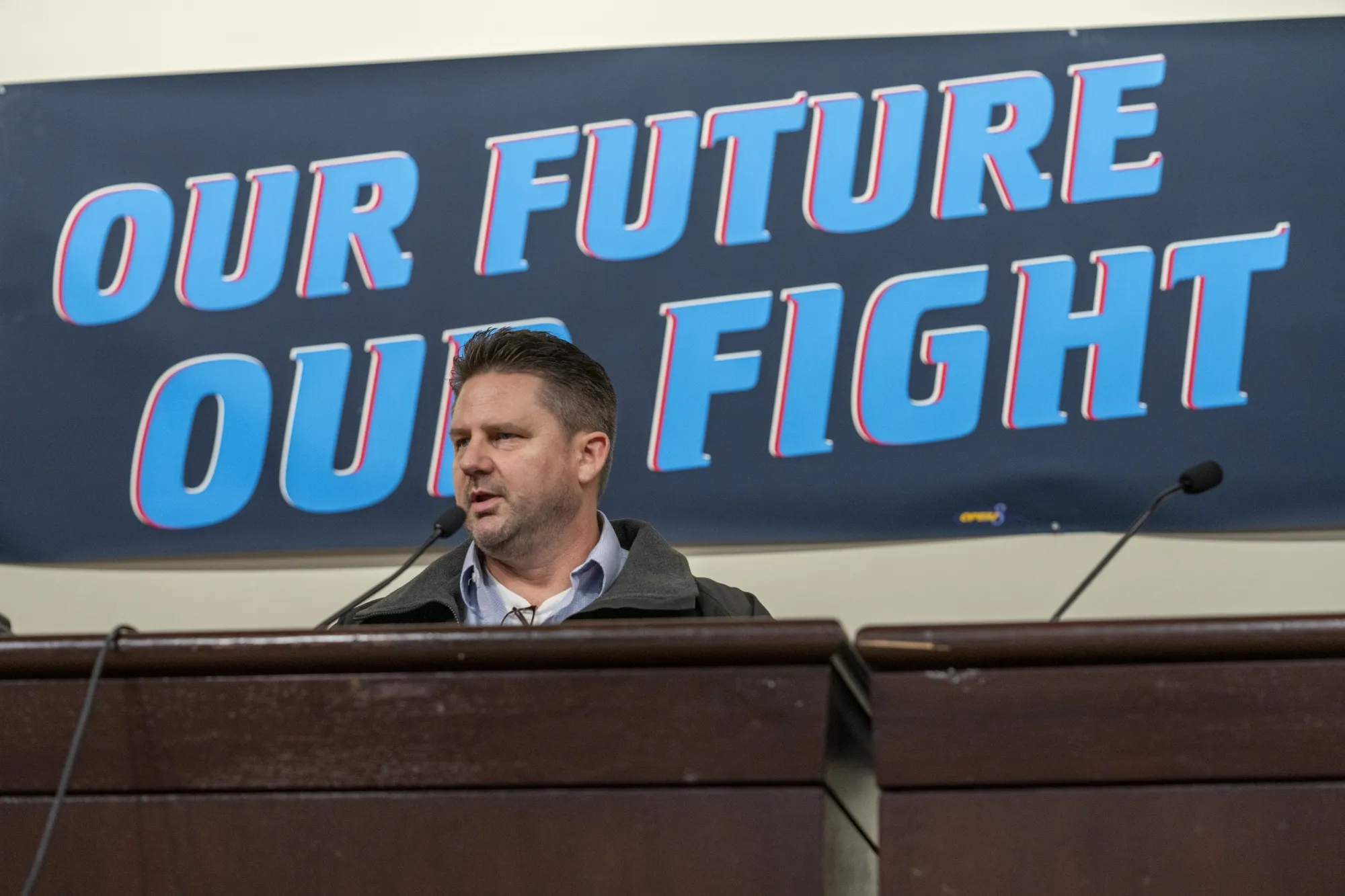乔恩·霍尔登,国际机械师和航空航天工人协会第751区主席。摄影师:M. Scott Brauer/Bloomberg在96%的成员投票支持罢工并拒绝了国际机械师和航空航天工人协会支持的协议后,工会谈判代表在谈判桌上采取了强硬立场。他们恢复了谈判开始时的两个原始要求:要求40%的加薪和恢复养老金。