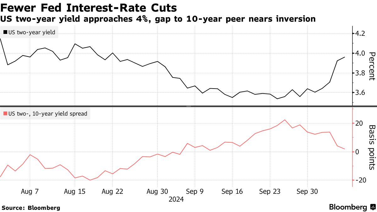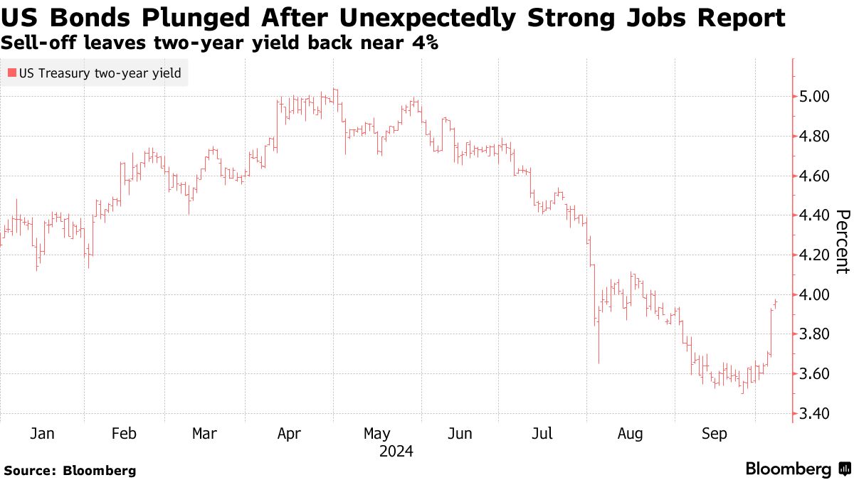周一债券下跌,延续了上周末的暴跌,此前意外强劲的9月份就业数据削弱了美联储再次大幅降息的可能性。10年期收益率上升了四个基点至4%,而两年期收益率也接近该水平,上升六个基点至3.98%。