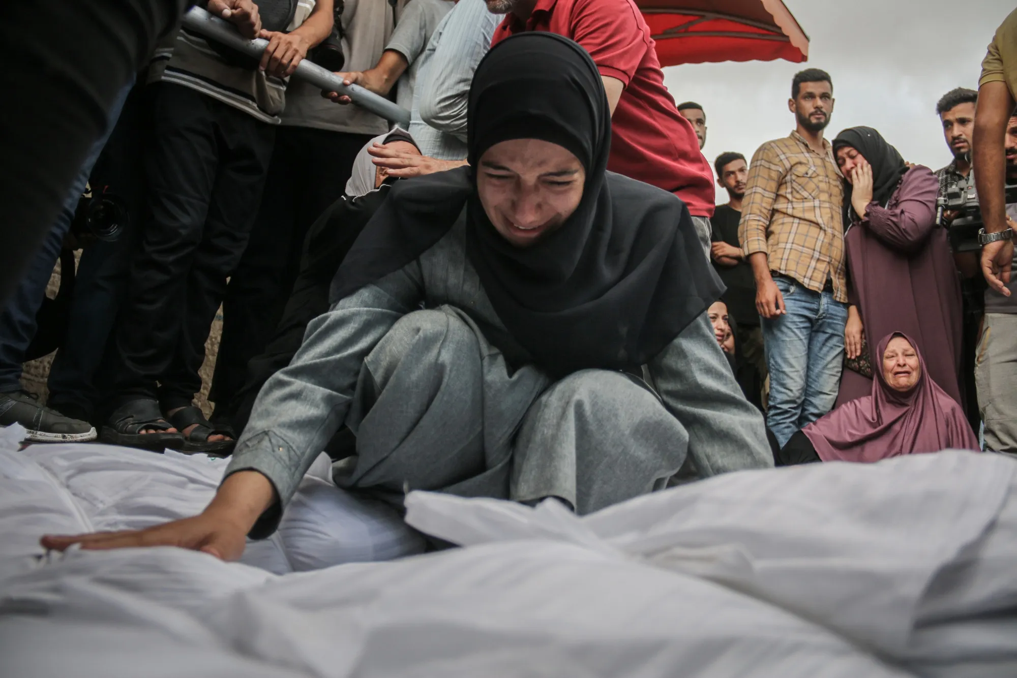 巴勒斯坦人在10月1日以色列对加沙努塞拉特难民营的袭击后,在阿克萨烈士医院哀悼亲属。摄影师:阿赫迈德·萨利姆/彭博社### 全球必读