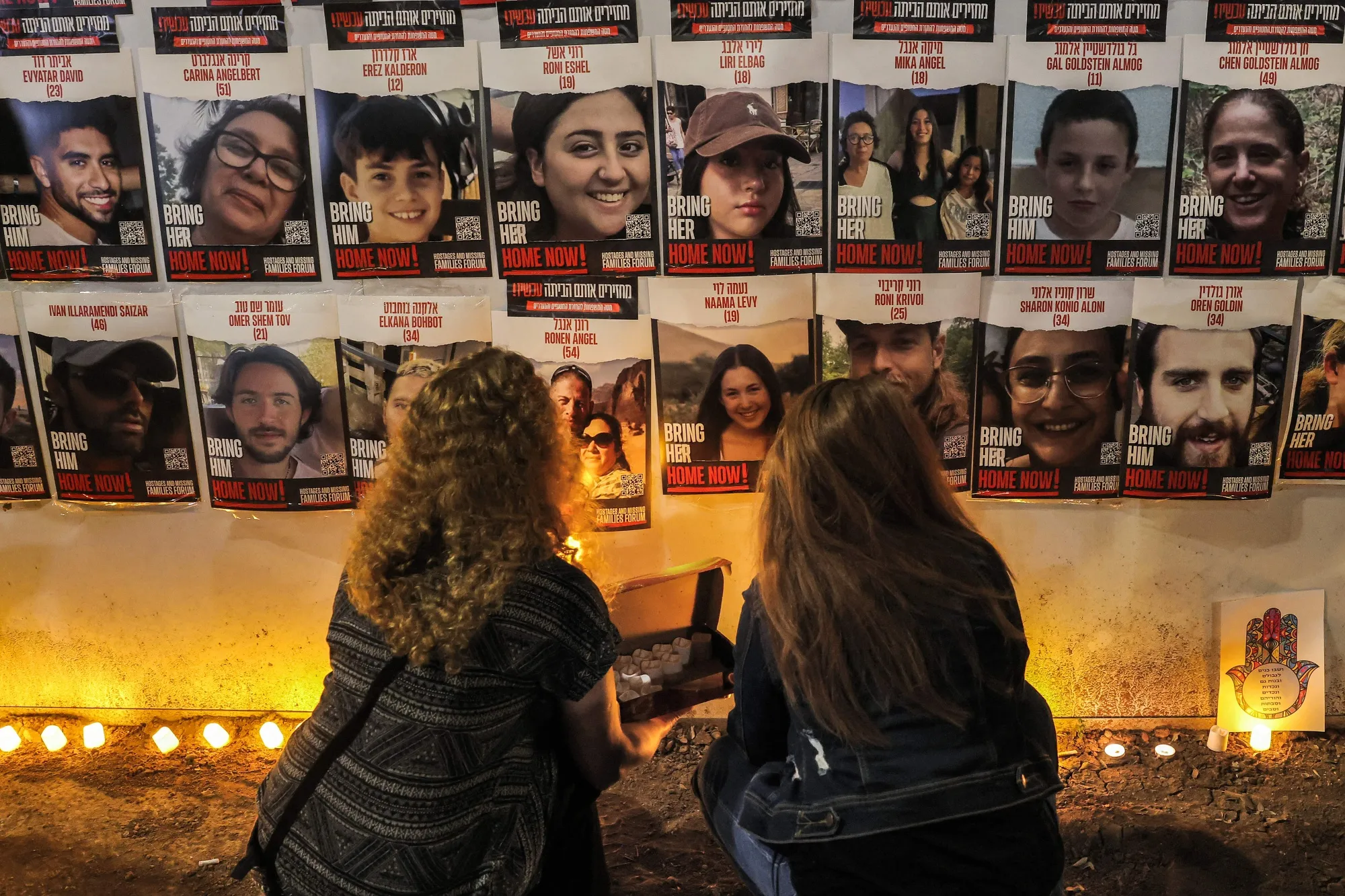 人们在10月7日以色列的墙下点燃蜡烛,墙上展示着被哈马斯绑架的人质海报。