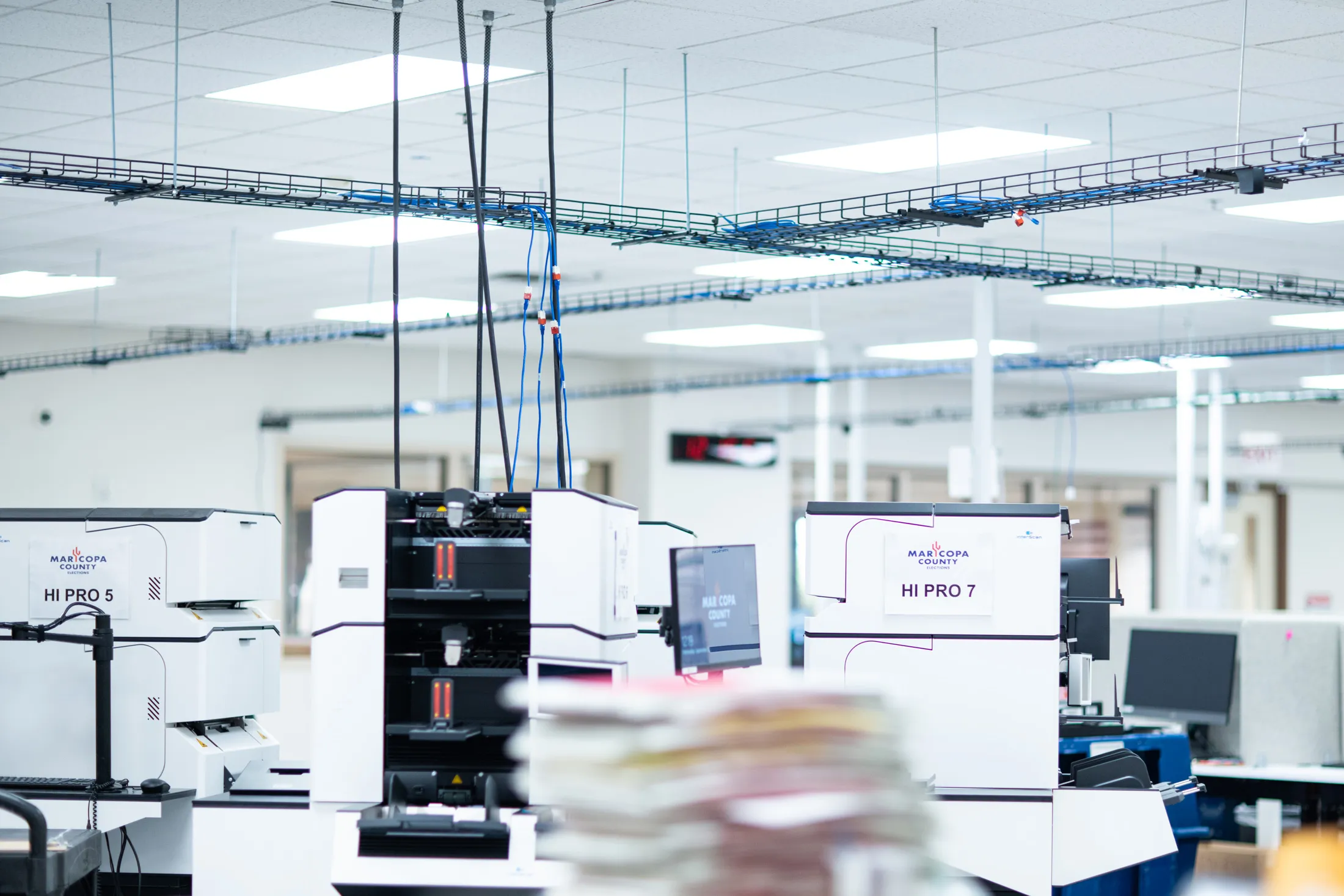 用于计数选票的计票机连接到一个安全服务器,配有新的开放布线,以便选民可以追踪路由。摄影师:Caitlin O’Hara/Bloomberg在计数选票的房间,即计票中心,只有拥有安全许可的人才能进入。没有任何选举官员可以进入该房间,连马里科帕县记录员 Stephen Richer 也不例外,记录办公室的通讯主任 Taylor Kinnerup 说。