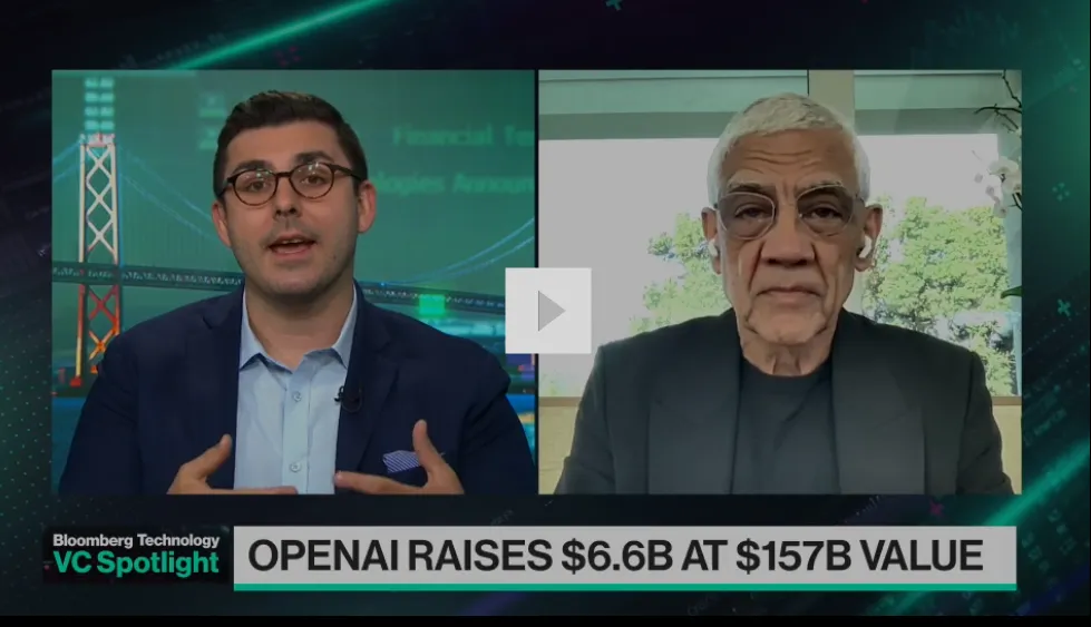 Khosla Ventures创始人、OpenAI早期投资者维诺德·科斯拉在彭博科技节目中谈论这家人工智能初创公司的新66亿美元融资轮。### 充电完毕