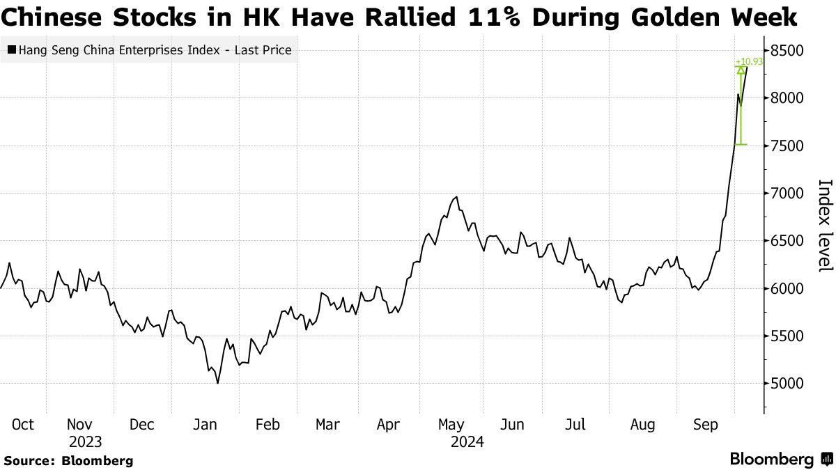恒生中国企业指数自上周黄金周假期开始以来上涨了11%,并在周一达到了两年多来的最高水平。