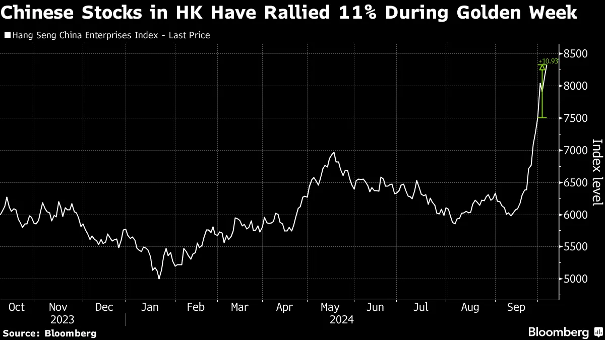 自上周黄金周假期开始以来,恒生中国企业指数的公司股价上涨了11%,并在周一达到了两年多来的最高水平。
