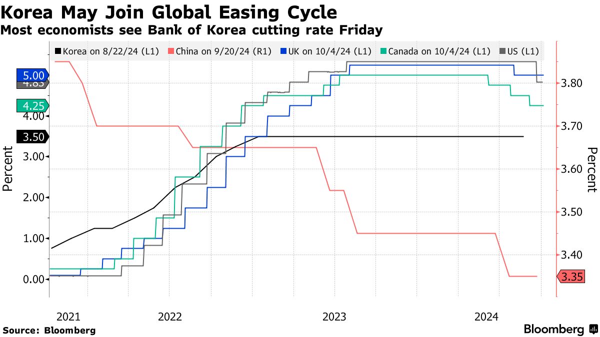 接受彭博社调查的22位经济学家中有20位预测,中央银行将在周五制定政策时将基准利率下调25个基点至3.25%。这将是自2021年8月韩国银行将利率从创纪录的0.5%上调以来的首次政策转变,以结束疫情时期的刺激。