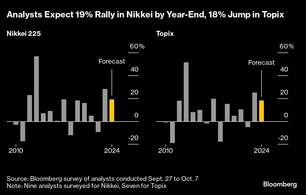 尽管不太可能重回7月份创下的纪录,但根据彭博社在9月27日至10月7日对九位分析师的平均预测,日经225指数可能在年底时较当前水平上涨1.3%,达到39,844。更广泛的东证指数将上涨2.1%,达到2,797,七位分析师的平均估计显示,这将使日经225的年增幅达到19%,东证指数的年增幅达到18%。