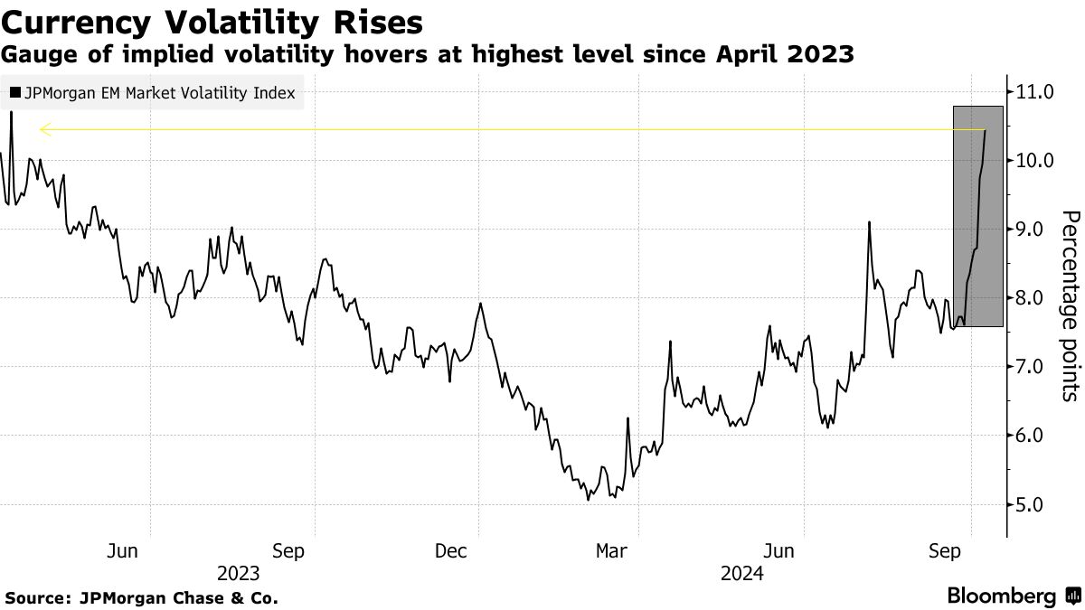摩根大通对未来货币波动性的测量在周一上升至10个百分点以上,为2023年5月以来的最高水平。它与七国集团先进国家的类似货币动荡指标之间的差距扩大至自6月初以来的最高水平。MSCI的新兴市场货币指数连续第五天下跌,创下自7月以来最长的跌势。