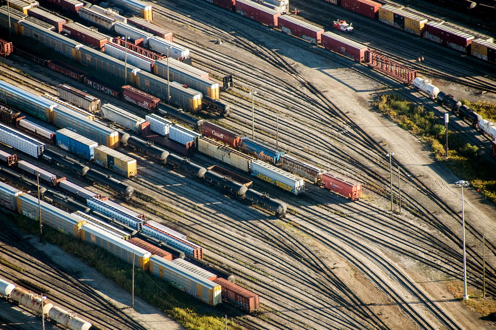 货运列车和油罐车停在多伦多上空拍摄的这个铁路 yard 中。