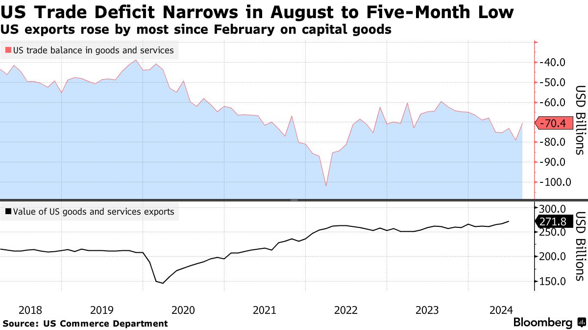商品和服务贸易的差距从上个月缩小了10.8%,降至704亿美元,商务部周二的数据表明。八月份的85亿美元缩小是自2023年3月以来的最大幅度。最新数据与彭博社对经济学家的中位数预估一致。