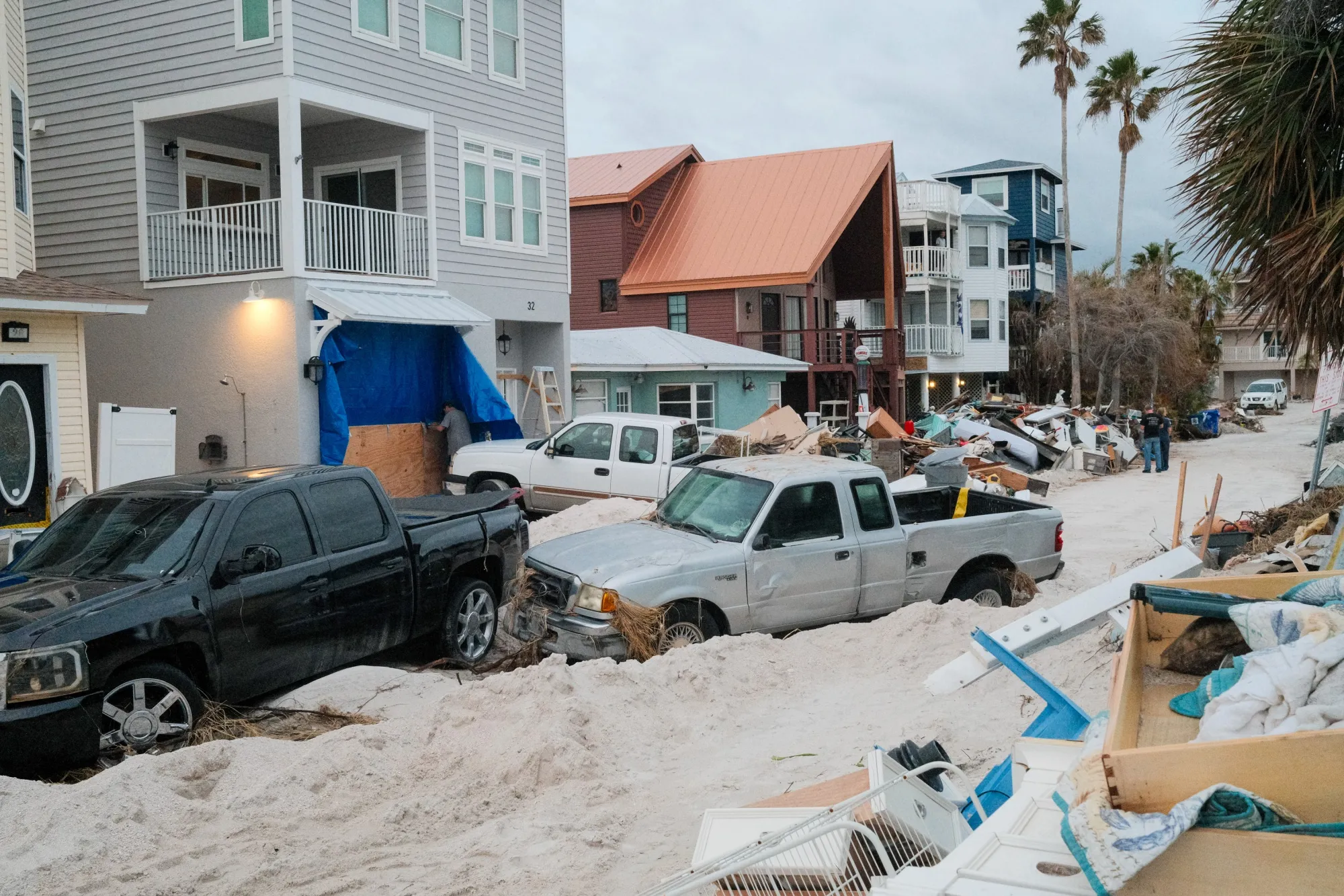 飓风海伦留下的车辆和残骸,预计飓风米尔顿将于10月7日在佛罗里达州的珍珠岛登陆。