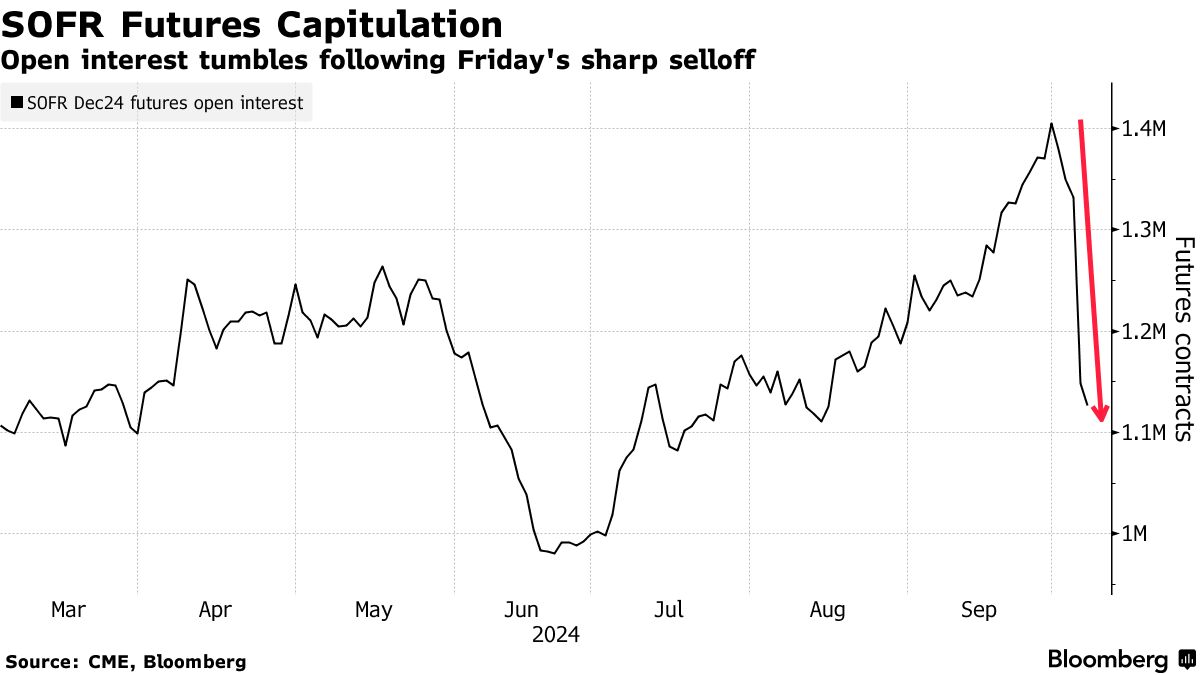 自上周末发布的强劲九月 就业报告以来,债券交易员们已开始放弃与 担保隔夜融资利率 相关的多个期货合约的多头头寸。这表明 看涨押注的解除,这些押注依赖于今年及2025年初的一系列大幅降息。