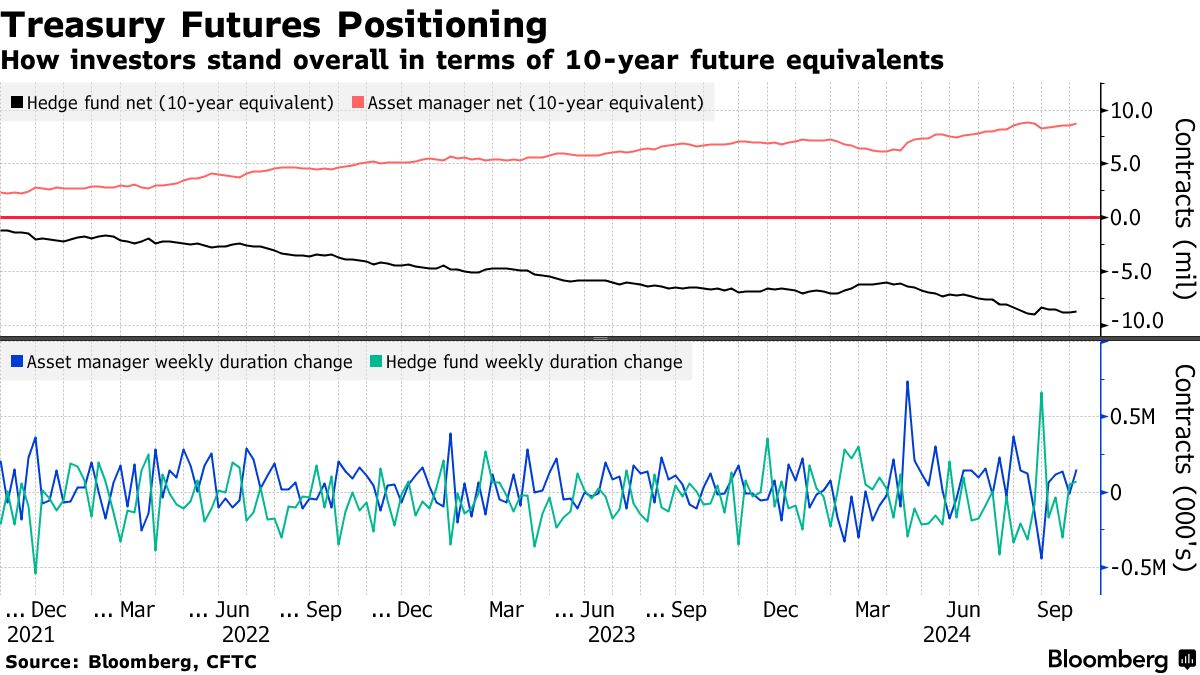 根据CFTC数据,杠杆基金在截至10月1日的一周内覆盖了约57,000个10年期国债期货的净空头头寸。在同一时期,资产管理公司增加了约152,000个10年期国债期货的净多头头寸。在SOFR期货中,资产管理公司以每个基点约4.4万美元的风险平仓了净多头头寸。
